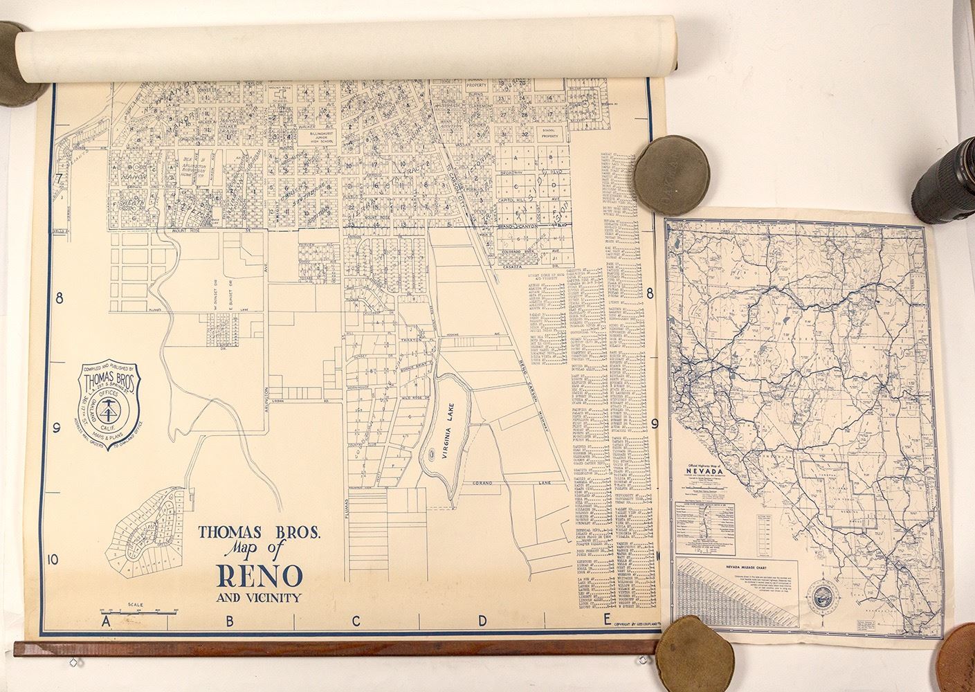 A nice blue print style real estate wall map by Thomas Bros. c 1940's with wood rollers on high quality paper. 25.5" x 61". Nevada Highway Map, 1949 16" x 22", top and bottom wrinkled. Date: Location: Reno, Nevada HWAC# 57259