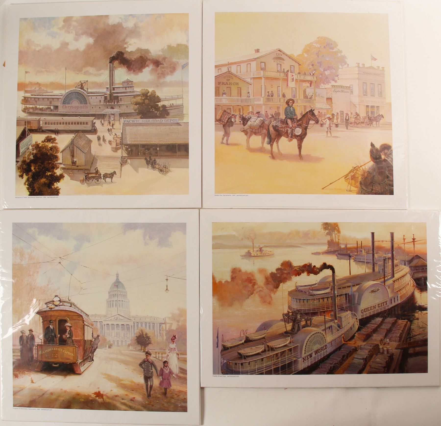 4 Old Sacramento prints-1849, 2 waterfront with ships and 1890 street car. 3x 17x17", Queen City 14x20"