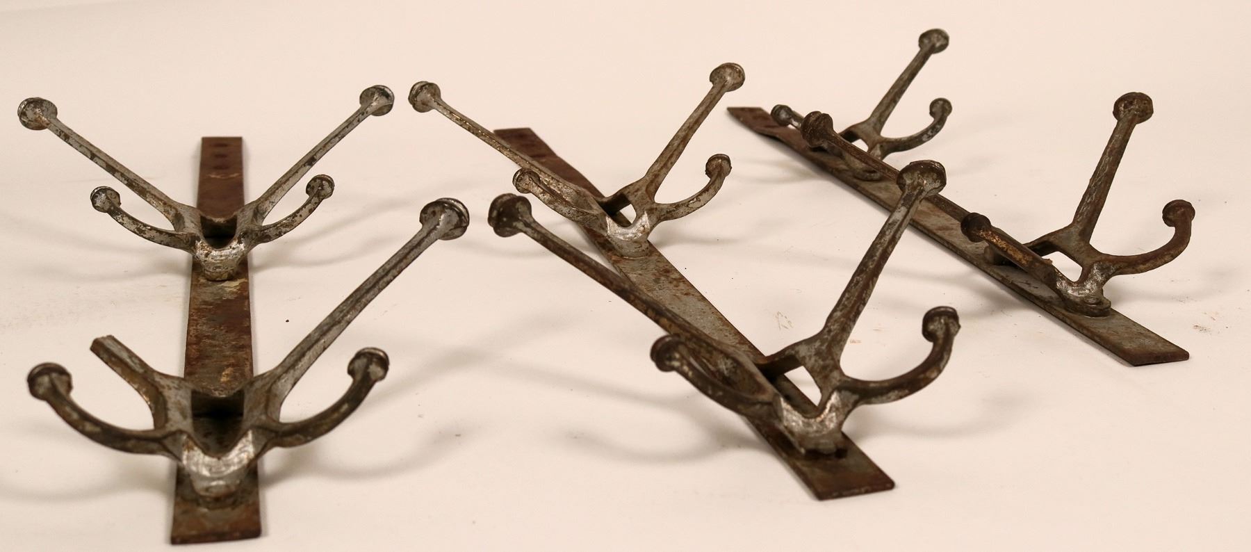 Three still functional wall coat or hat hanging hooks ready for you 10 gallon hat, bwoler or frock coat. There are three separate hangers with four hanging hooks on each. There is damage to one of the hooks. See photos for more details.