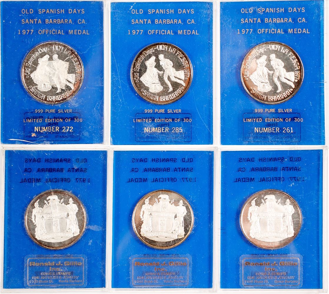 Lot of three .999 pure silver medals commemorating the 1977 Old Spanish Days celebration. Numbers 261, 272 and 285 out of 300 made. All in plastic cases, royal blue cardboard with gold lettering. Obverse: two dancers; reverse: Indian and Spanish Conquistador standing around banner. HWAC# 61923 Date: 1977 Location:
