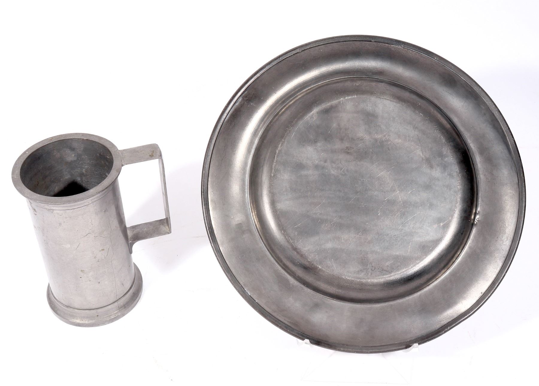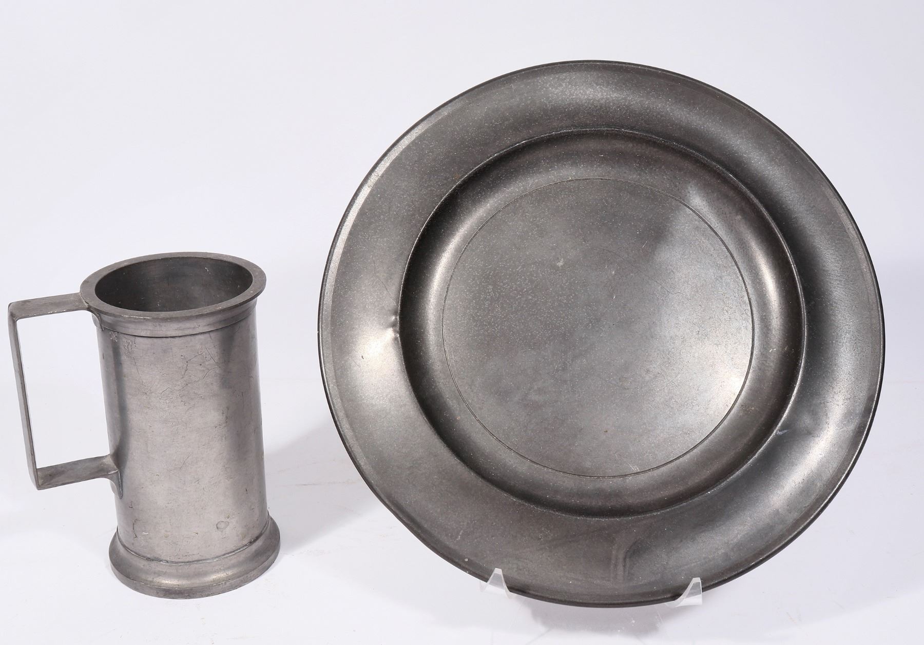 Cup and plate of pewter. Plate (10 inch diameter) marked London, England on reverse. Mug is 6 inches tall and 3 inches in diameter.