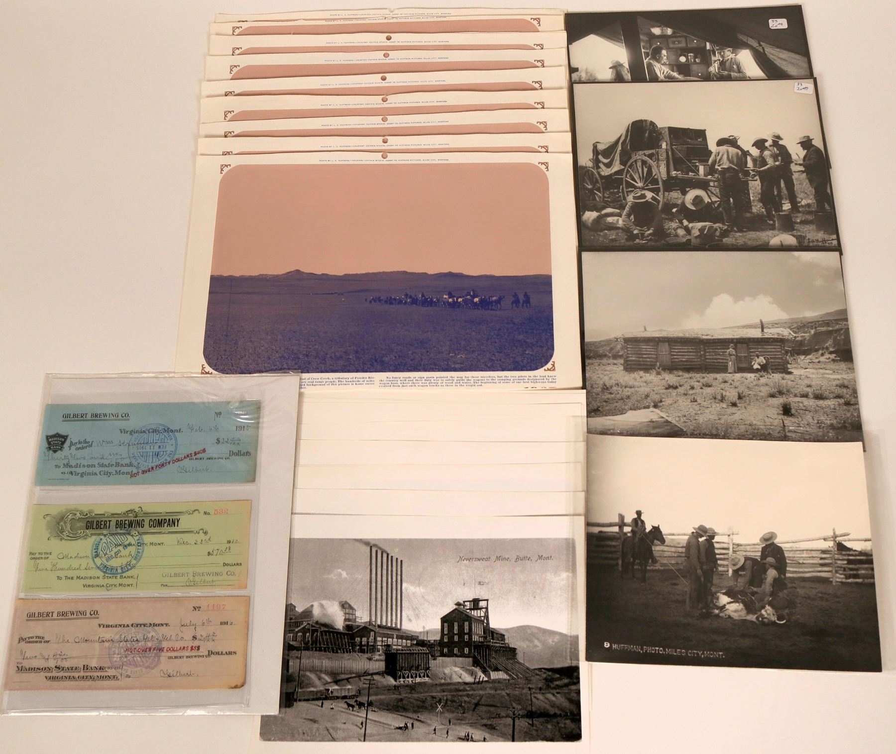 Lot is Old West themed, with three cancelled checks from the Gilbert Brewing Company, four 8"x 10" photos showing cowboys taking chuck, and several what appear to be 10"x 15" calendar pages showing photos of American Indians. All in good condition.