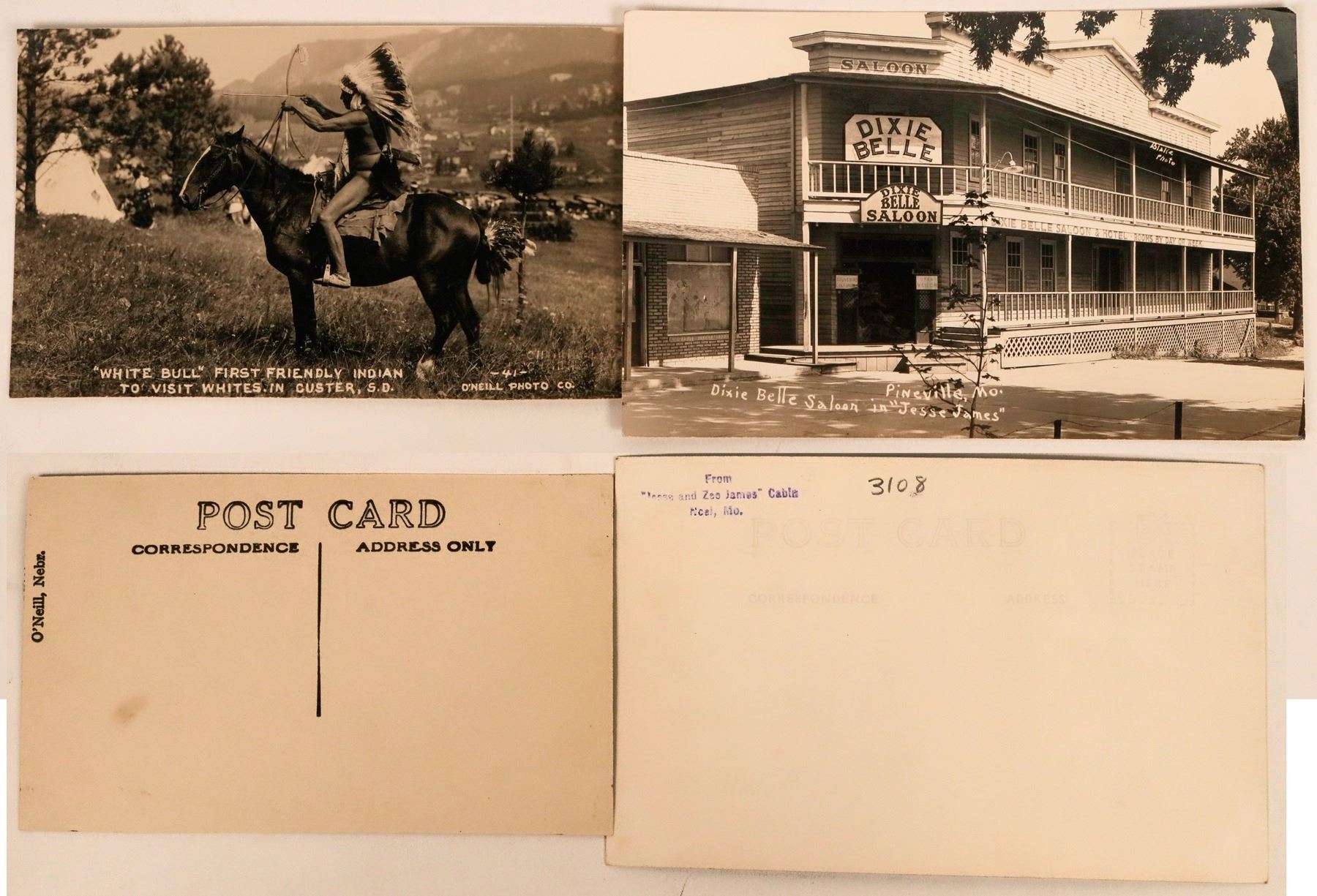 A pair of RPC's depicting the Old West. The first is a photo of Dixe Belle Saloon in "Jesse James" Pineville, Missouri. the other is a photo of American Indian White Bull, billed as the "First Friendly Indian to visit whited in Custer, South Dakota. Both are in good condition.