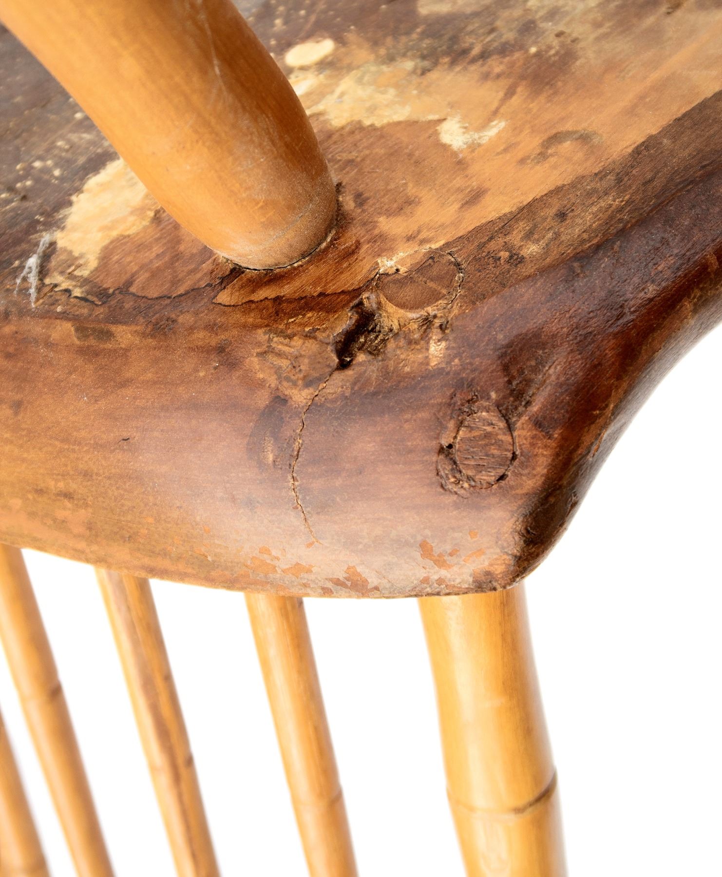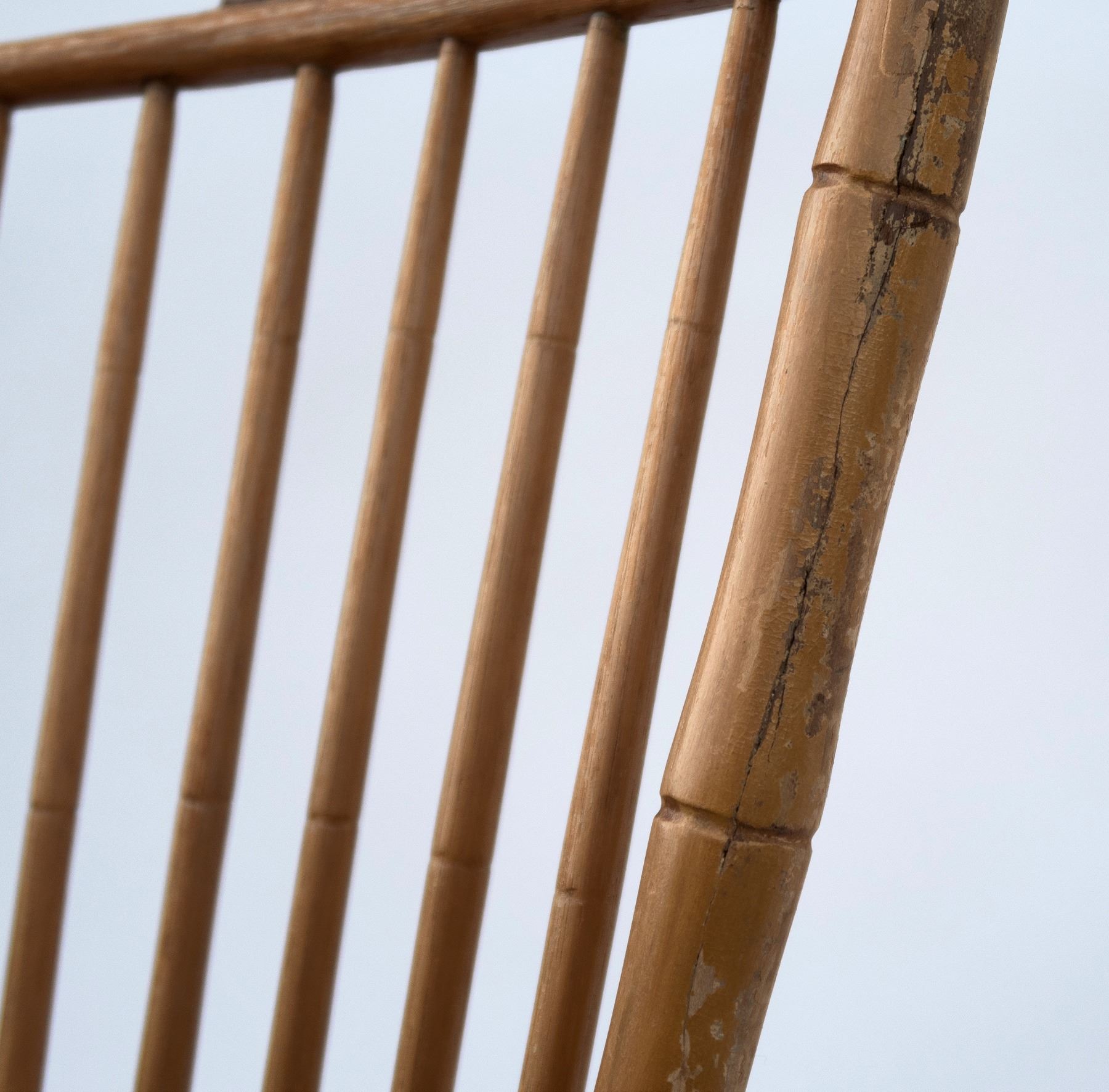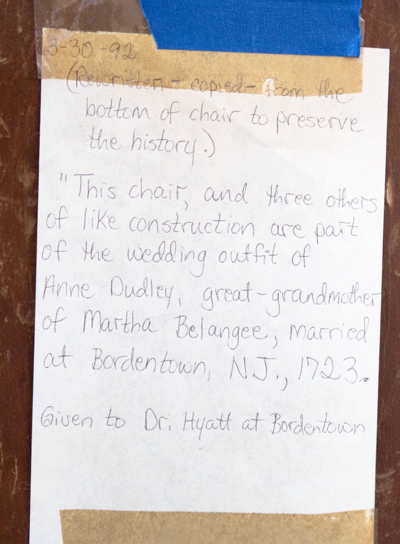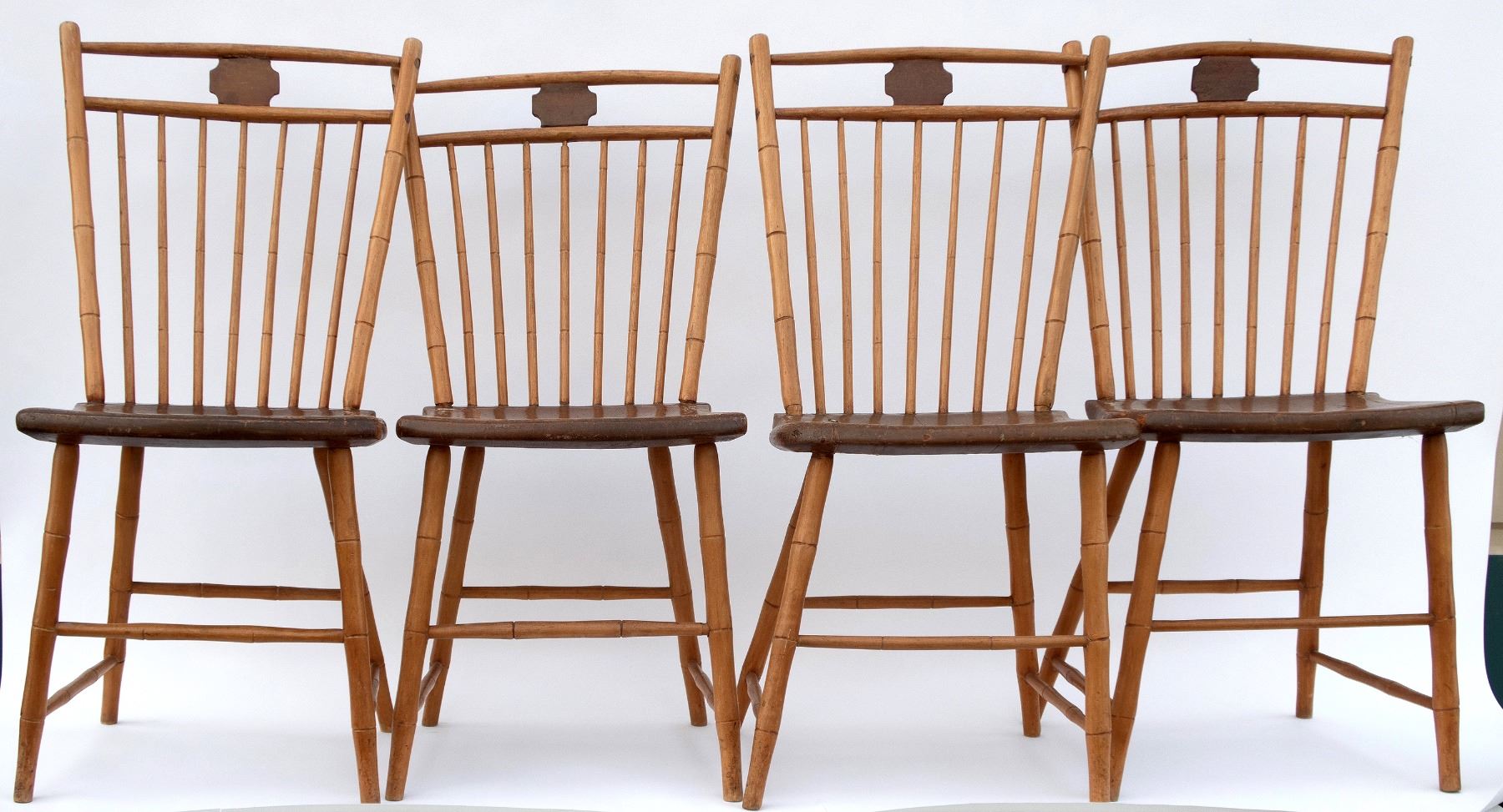 4 light wood, perhaps pine, chairs. As per old note on bottom of a chair, "This chair, and three others of like construction are part of the wedding outfit of Anne Dudley, great grandmother of Martha Belange, married at Bordentown, 1723. Given to Dr. Hyatt at Bordentown." Uprights and legs have carved bands in the style of bamboo. 2 seats have cracks. One has 8 drilled holes underneath seat, another has 10 drilled holes underneath. 34x16.5x15.5". These chairs are fragile and should be evaluated before using as seating. From the Hyatt Estate.