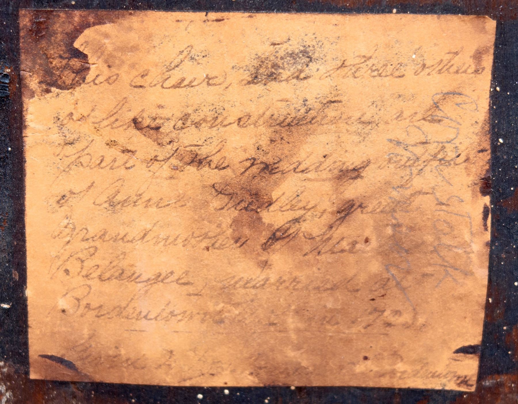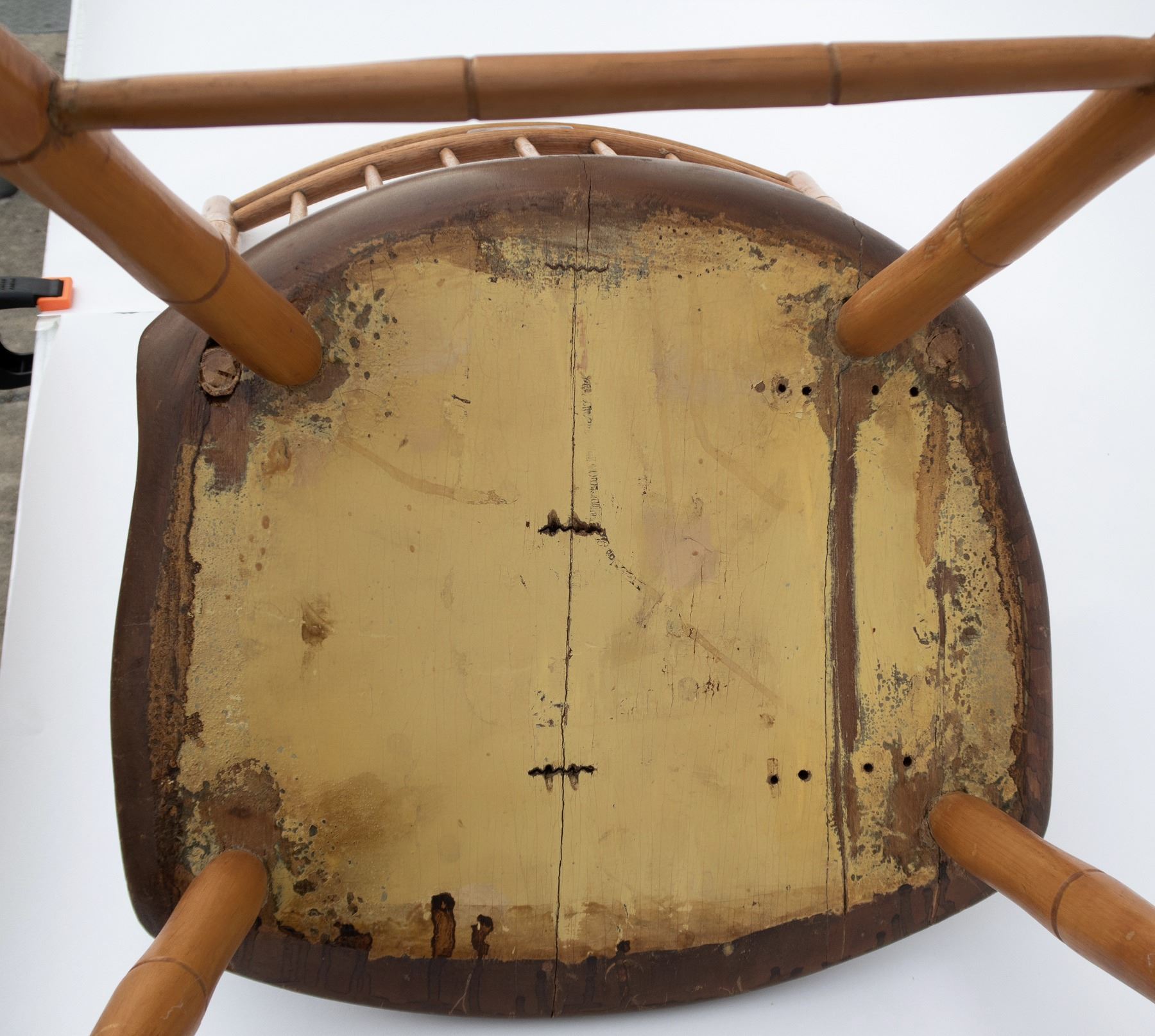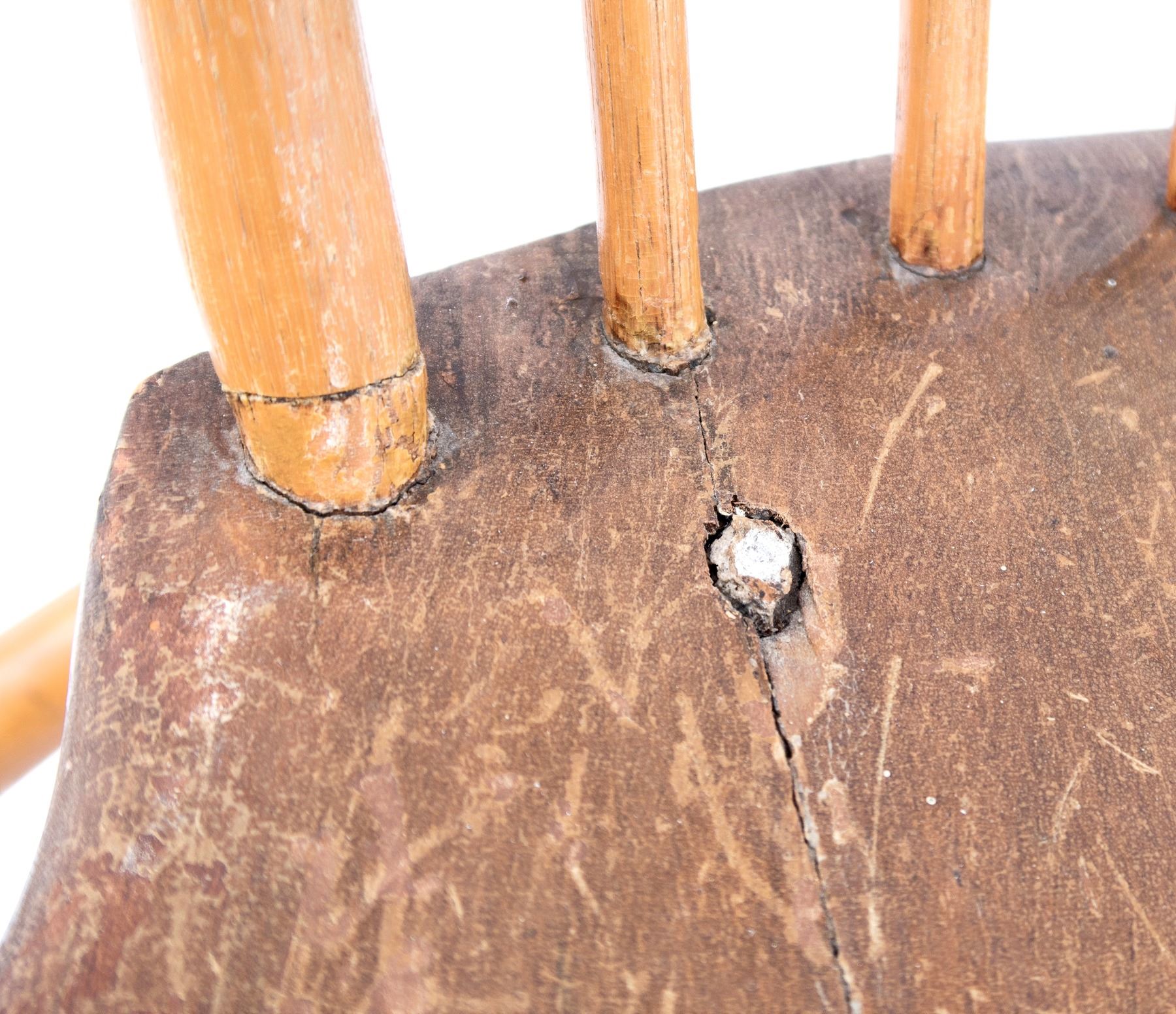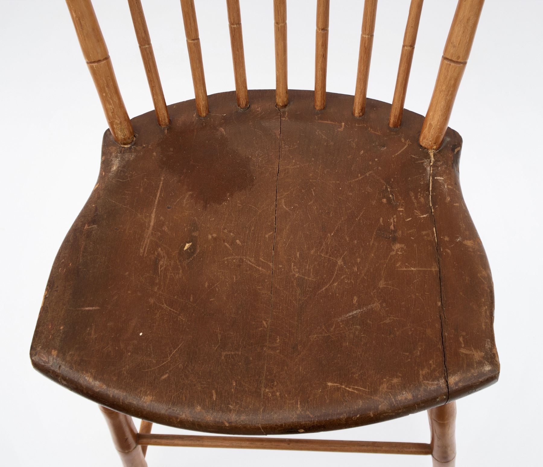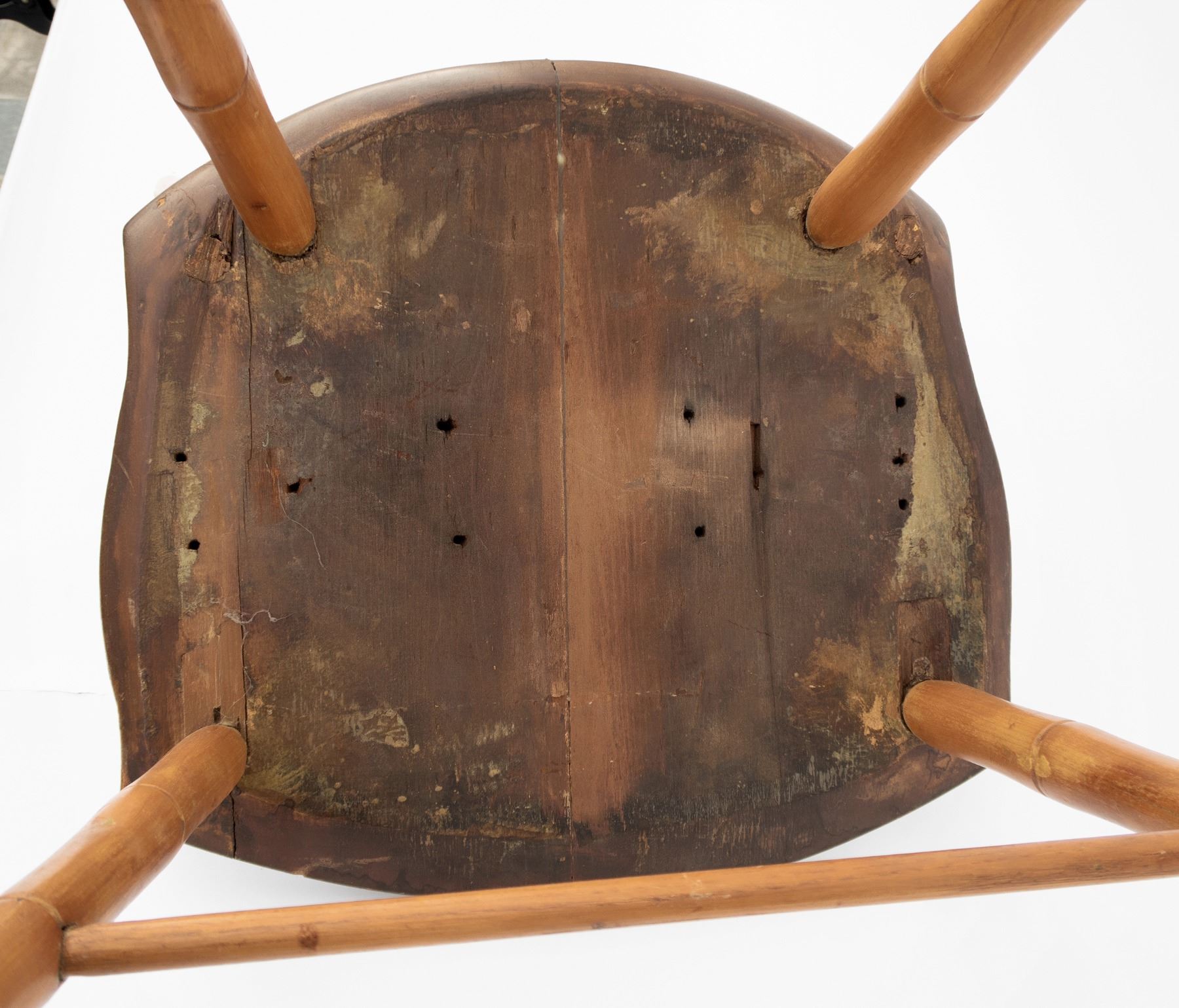 4 light wood, perhaps pine, chairs. As per old note on bottom of a chair, "This chair, and three others of like construction are part of the wedding outfit of Anne Dudley, great grandmother of Martha Belange, married at Bordentown, 1723. Given to Dr. Hyatt at Bordentown." Uprights and legs have carved bands in the style of bamboo. 2 seats have cracks. One has 8 drilled holes underneath seat, another has 10 drilled holes underneath. 34x16.5x15.5". These chairs are fragile and should be evaluated before using as seating. From the Hyatt Estate.