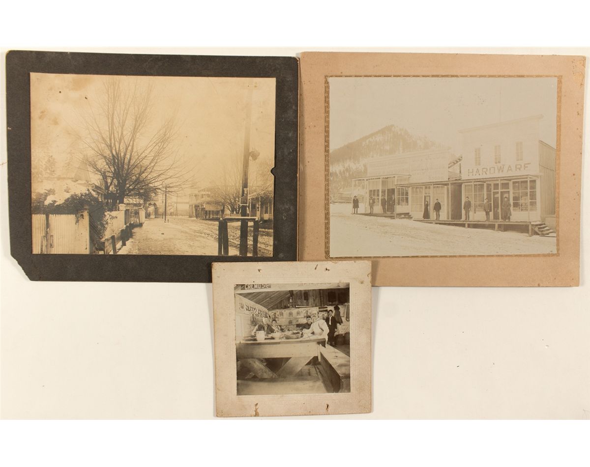 Lot of three unidentified scenes: folks on the porch of a hardware store, 8 x 6"; wintertime street view, 8 x 6"; and 5 posed people in a store or restaurant, 4 x 4".