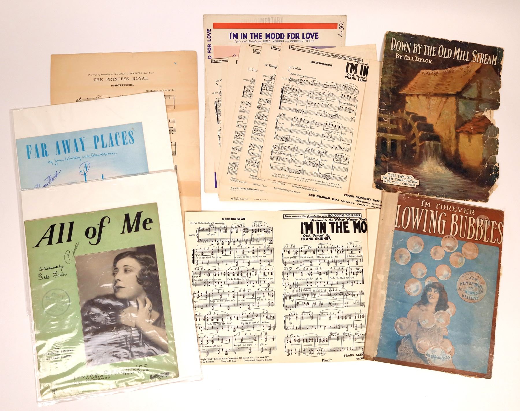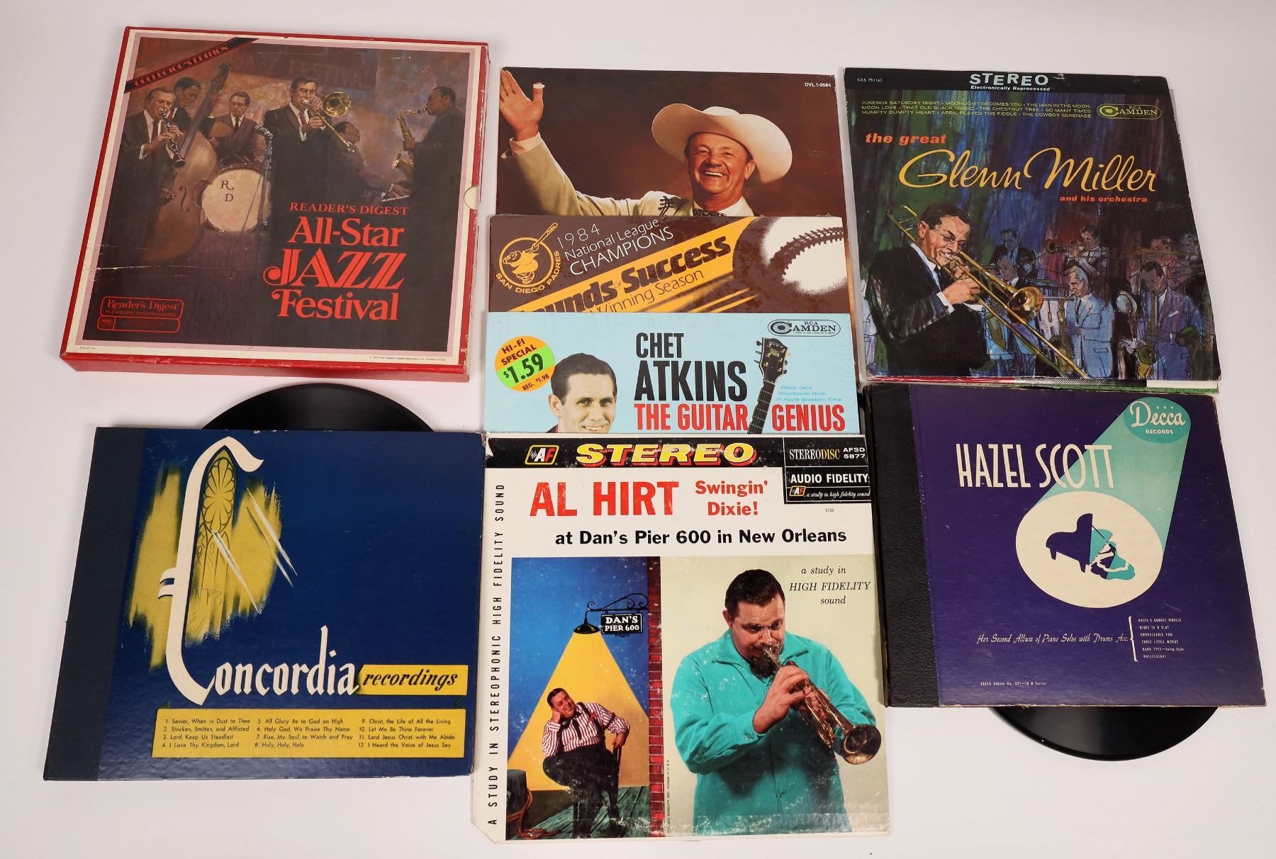 Readers Digest All Star Jazz Festival 8 record box set. Decca Hazel Scott 3 record set. Assorted 10"'s. Montana Slim. Padres Sound of Success. Chet Atkins mono, Al Hirt, Glenn Miller, James Cagney in Yankee Doodle Dandy, The First Family. Sheet Music-I'm in the Mood for Love, All of Me, Down by the Old Mill Stream.