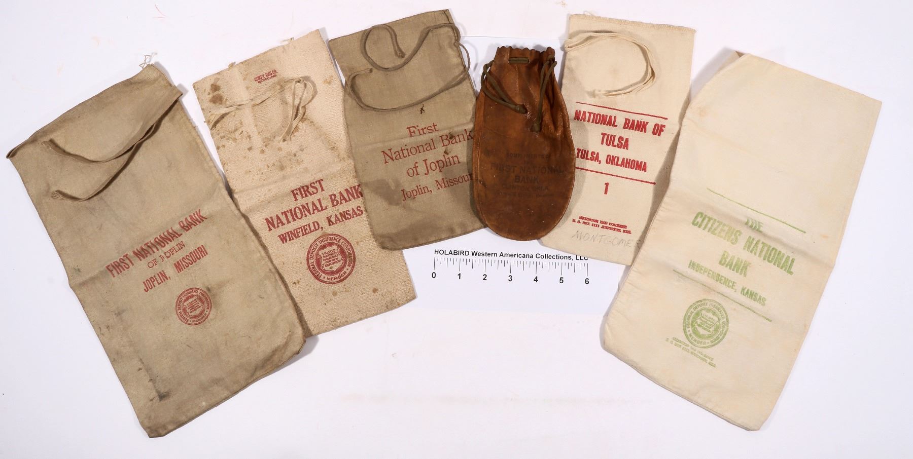 6 smallish older Midwestern coinbags. Leather poke, First National Bank, Clinton, Okla. First National Bank, Winfield, Kansas-stains. National Bank of Tulsa. Citizens National Bank, Independence, Kansas. 2 different sizes of First National Bank of Joplin-stains. Gary Bracken Collection