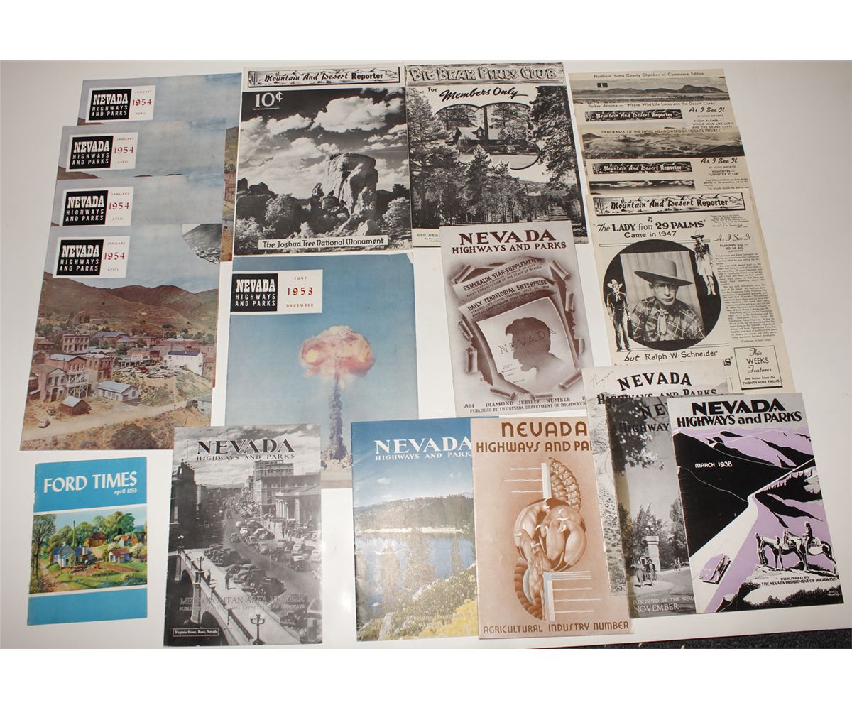 12 volumes: 1936 Rye Patch and petroglyphs, 1937 UNR and Las Vegas underpass, 1938 tourism, 1939 75th anniversary, 1940 agriculture and industry, 1940 Reno and Sparks, 1946 tour through Nevada, 1953 Atomic Test Site, and 1954 (4) Virginia City and Pyramid Lake. Also includes five volumes of the Mountain and Desert Reporter (1948) and one Big Bear Pines Club. History unfolds! Date: 1936-1954 NV hwac 20029