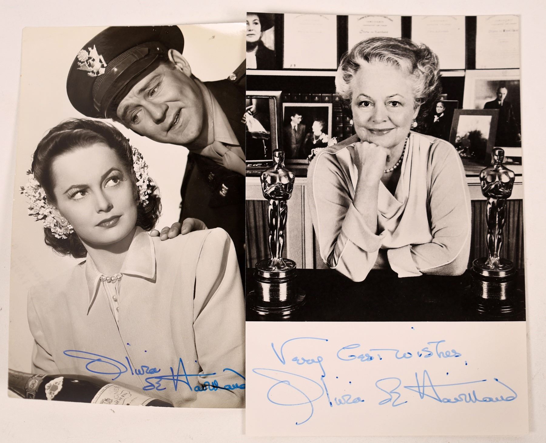 A pair of B&W signed photograph of leading lady Olivia de Havilland (1916-2020). Ms. De Havilland had a long career in Hollywood and is best remembered for her portrayal of Melanie Hamilton in "Gone With the Wind." A two-time Oscar winner, de Havilland/Wilkes, whose sister Joan Fontaine (1917-2013) was also an Academy Award winner, lived to be 104, passing away in France just last year. One of the photos measures 4"x 6" show de Havilland flanked by her Oscars. The other measures 3"x 5" is a publicity shot from the 1946 film "A Well Groomed Bride" with co-star Sonny Tufts. Signatures are clear. Please see photos for more detail and condition.