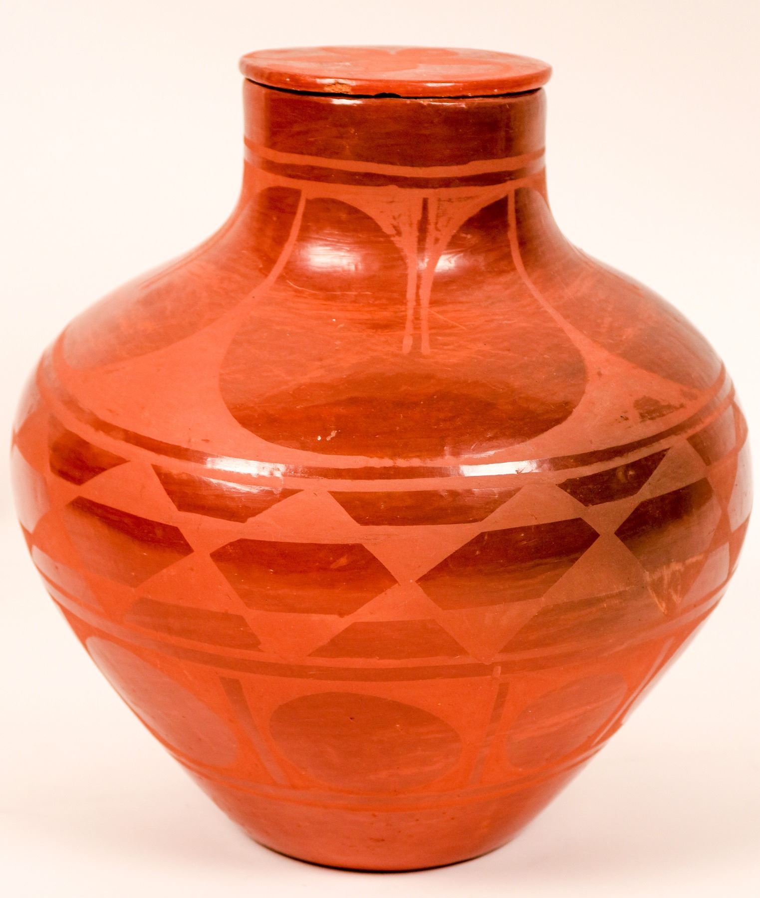 Kewa Pueblo potter Vidal Aguilar, a member of the famous Aguilar family of potters dating back to the late 1800s with the Aguilar sisters of fame. Vidal Aguilar makes some of the largest polychrome ollas at Santo Domingo in the Aguilar family tradition. His pottery is hand coiled and polished. Red on red olla with lid--11" h x 10" diameter. Very good condition.