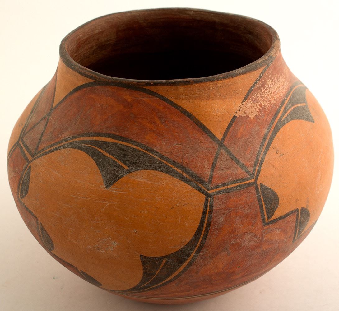 Olla from Laguna Pueblo. Design is Kiva step and arch. Unsigned, 6.25" h x 7.5" diameter. Pot has been used, shows wear. The youngest of today's pueblos, Laguna Pueblo also has one of the largest land reserves of all pueblos. The settlement was established between 1697 and 1699 by refugees seeking to avoid warfare with the Spanish. State:New Mexico City:Laguna Pueblo Date: ID# 49744