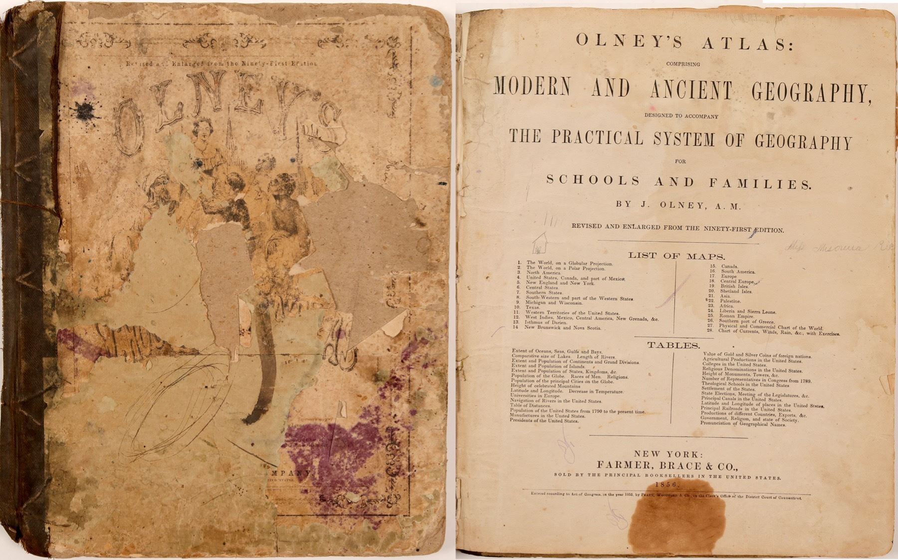 Olney's Atlas comprising Modern and Ancient Geography, designed to accompany the Practical System of Geography for Schools and Families. Published by Farmer, Brace & Co. in 1856. 70 pages, 10 x 12 inches. Obviously well used over the years, the covers worn nearly off, many notations in pencil throughout the volume.