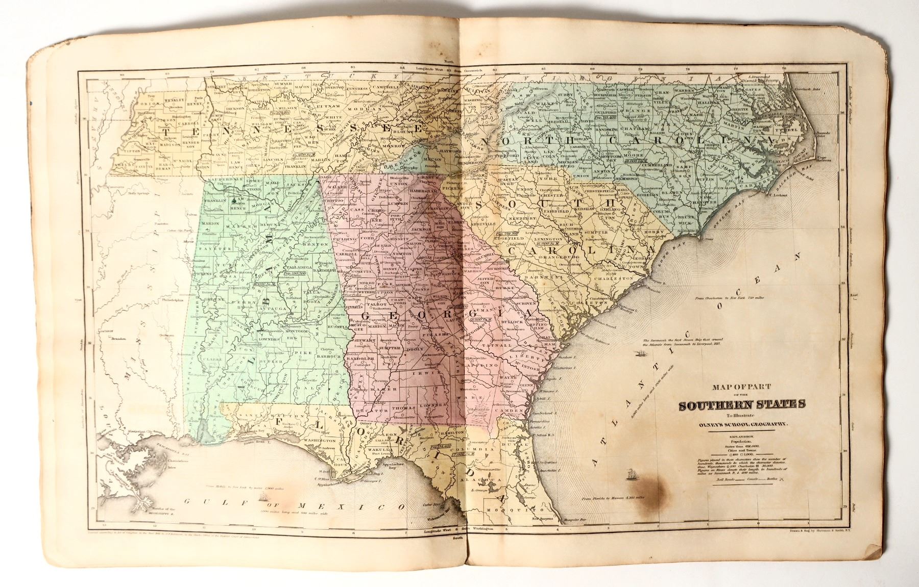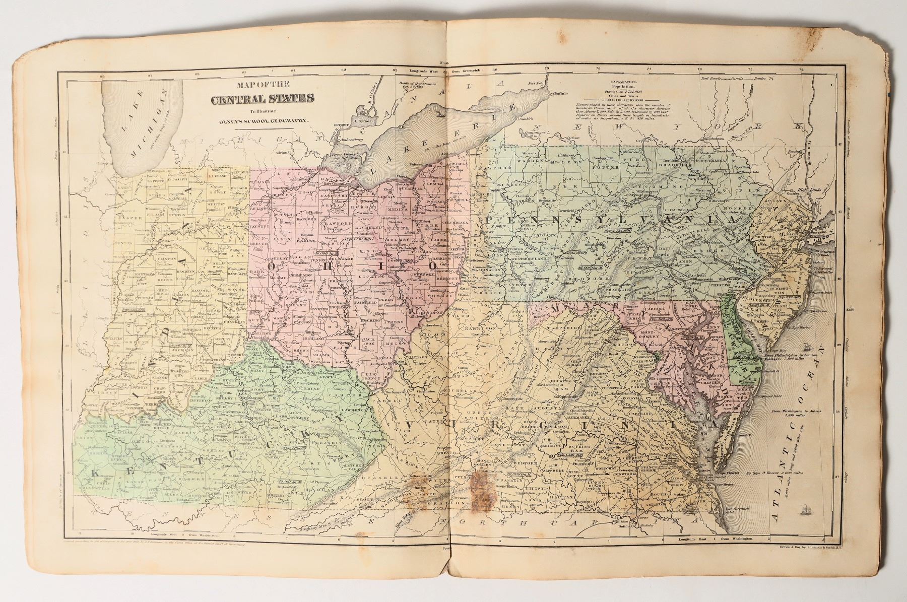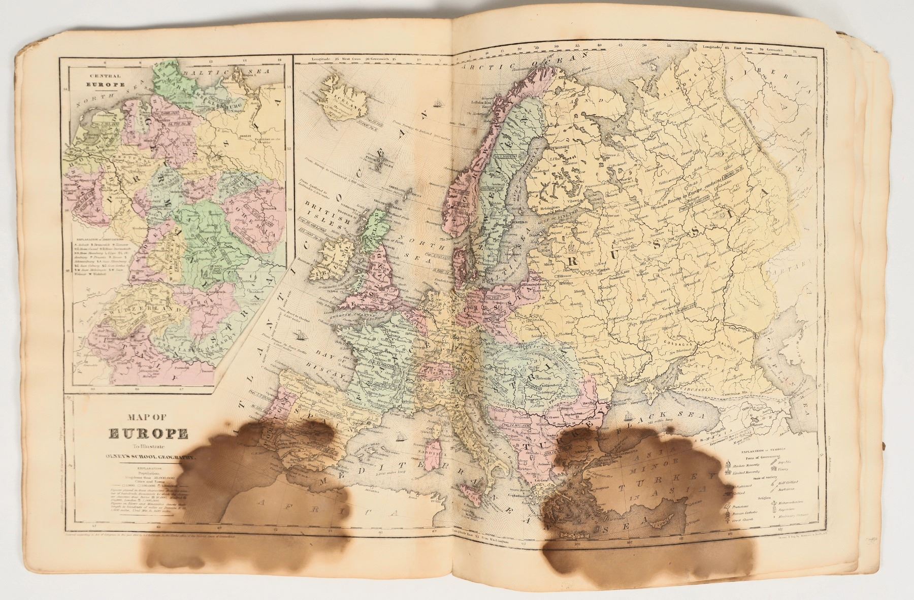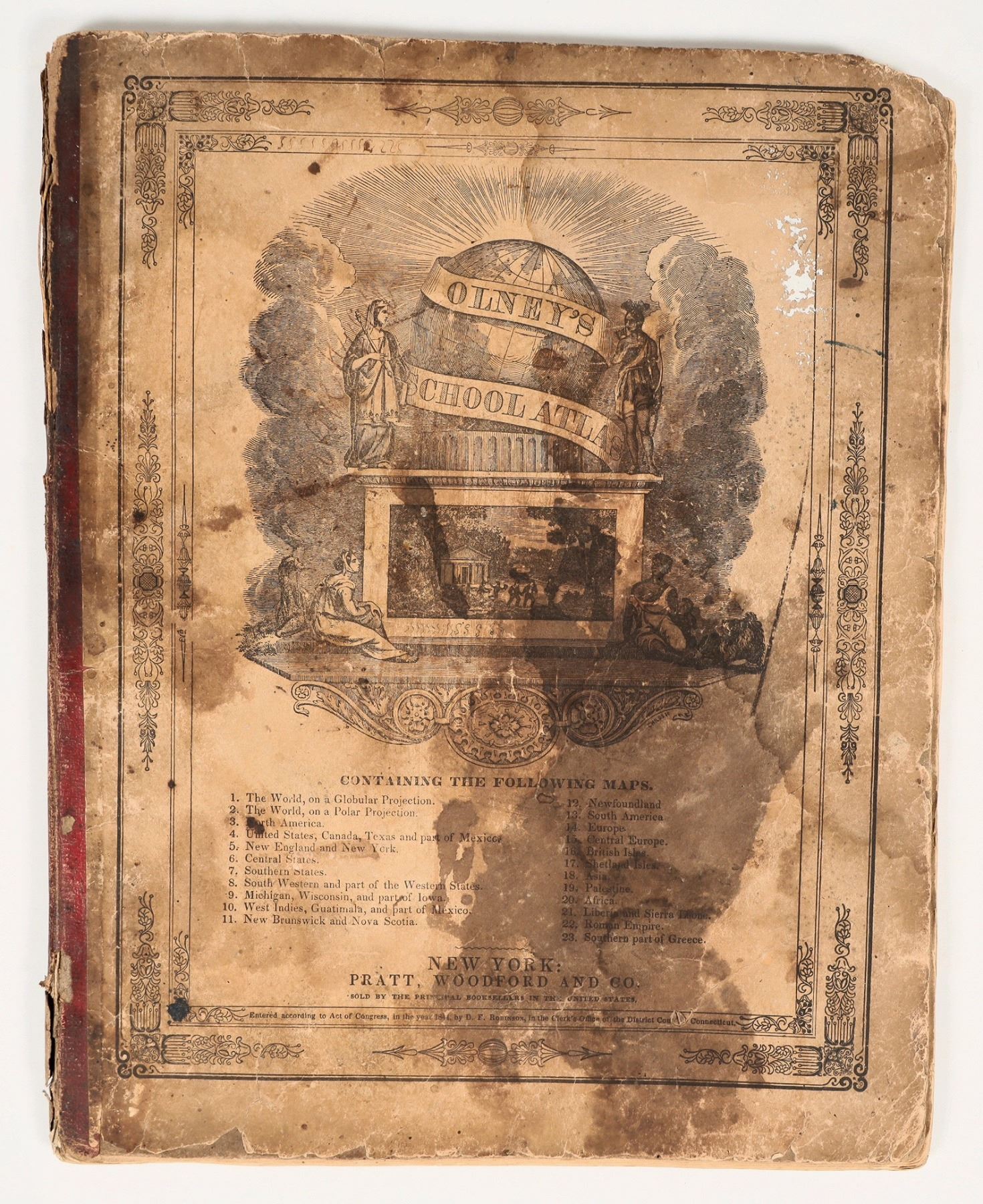 A copy of 'Olney's School Atlas', published 1844 by Pratt, Woodward & Co. of New York. Contains maps of locations around the world, including North & South America, Europe, Asia, Africa, and the Middle East. Includes several maps focusing on different U.S. regions. Extremely rough condition, foxing + staining throughout with very dark staining on cover and some maps. See photos. 9.5"x12".