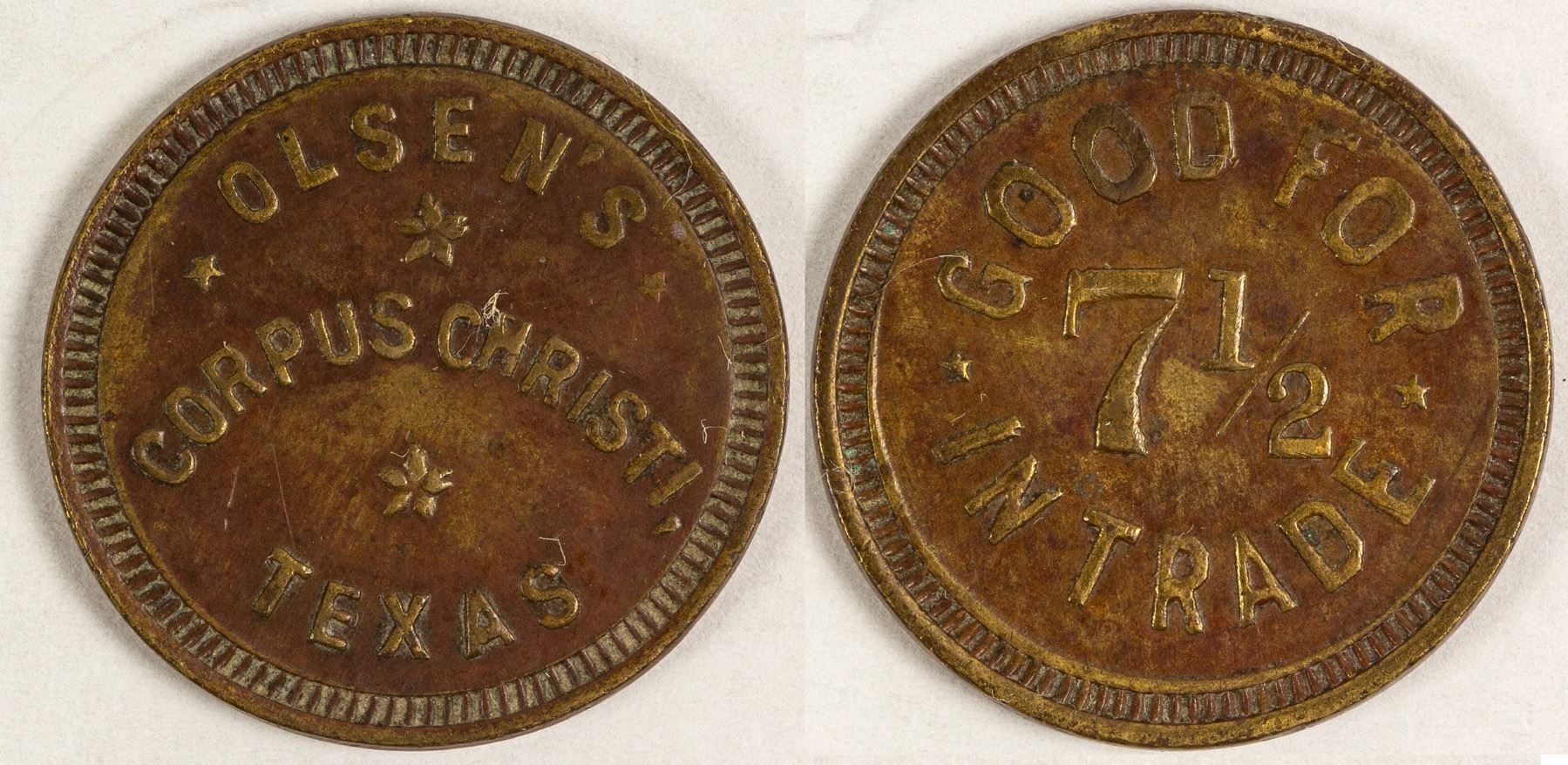 Obv.: Olson's / Corpus Christi / Texas; Rev.: Good For / 7 1/2 / In Trade. Br., rd., 20 mm. R. B. Worthington Collection. State: Texas City: Corpus Christi Date: ID# 78525