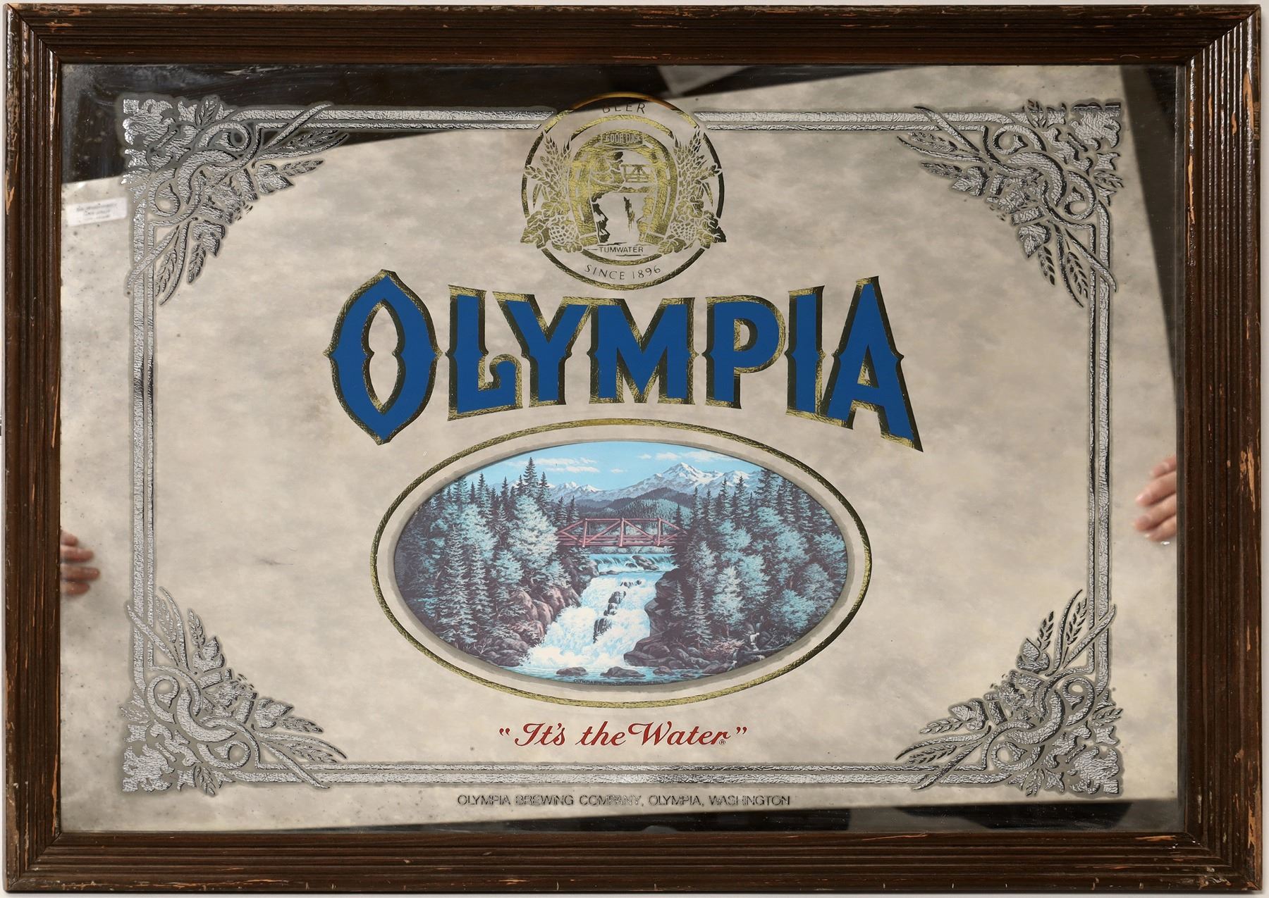 Lot of 2 advertising mirrors. Both mirrors have a gold insignia with a horseshoe in the top center of the mirror. Both have label of the damn and river with "It's the Water" in red. Both are in used condition.