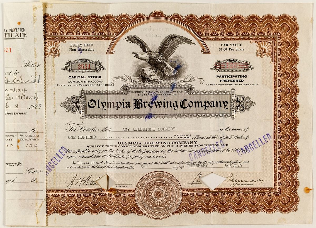 Rare brewery stock certificate from the Olympia Brewing Company issued in 1937 to Amy Allbright Schmidt and signed by a Schmidt as vice president. Cert. #2521 was issued for 100 shares. The company was incorporated at Olympia, Washington in 1896. Leopold F. Schmidt built a brewery at Tumwater, Washington, where there were artesian springs. Thus, the company's slogan, "It's The Water" was born. The certificate has two diamond shaped cut cancels through the signatures. City: Olympia State: Washington Date: 1937 hwac# 35436