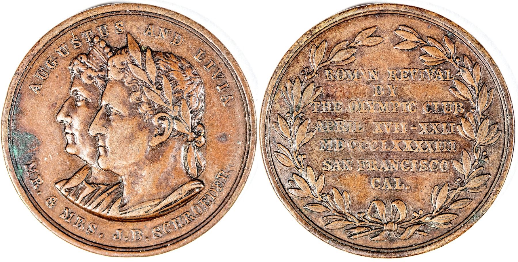 Obv: Augustus and Livia / Mr. & Mrs. J. B. Schroeder; Rev: Roman Revival / By / The Olympic Club / April XXVII-XXII / MDCCCLXXXXIII / San Francisco / Cal. Br., rd., 31 mm.