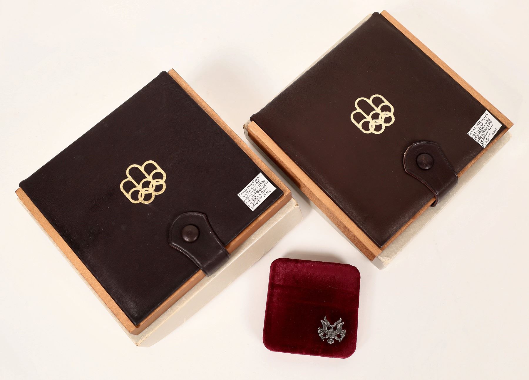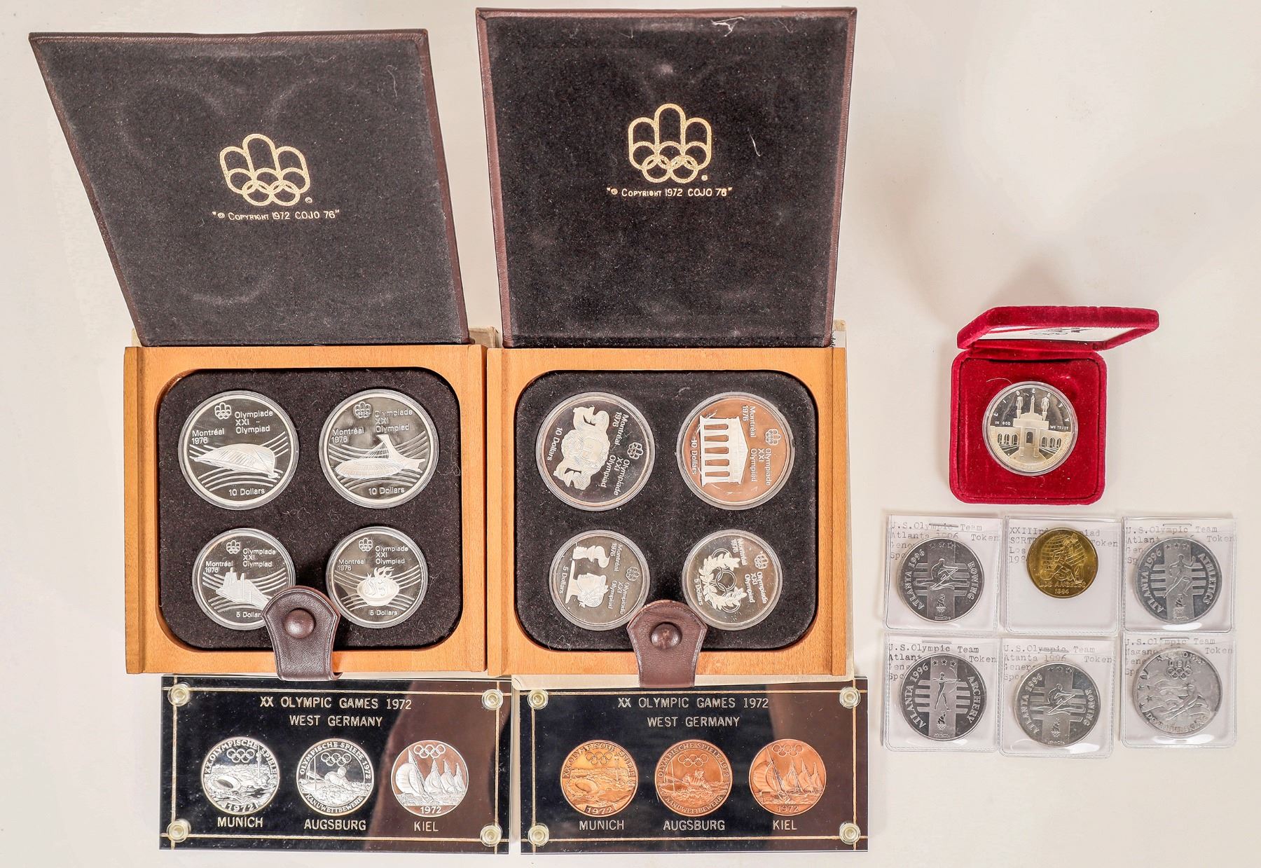 Group of coins and medals from various Olympics. 1972 West Germany: three silver, three bronze medals; 1976 Montreal: two sets of four coins, two $5 (.72 oz. silver) two $10 (1.44 oz. silver) in wooden cases; 1984-S proof silver dollar (Los Angeles);1984 SCRTD fare token Los Angeles; 1996 five General Mills tokens from Atlanta.