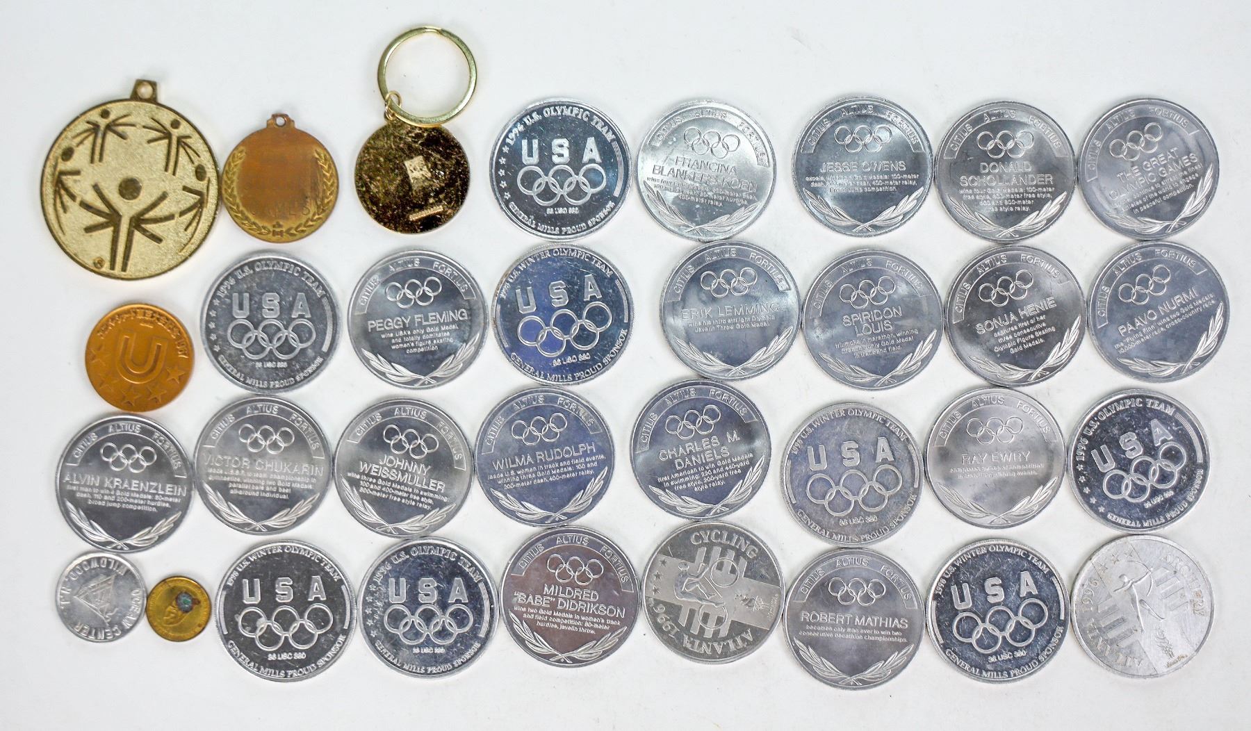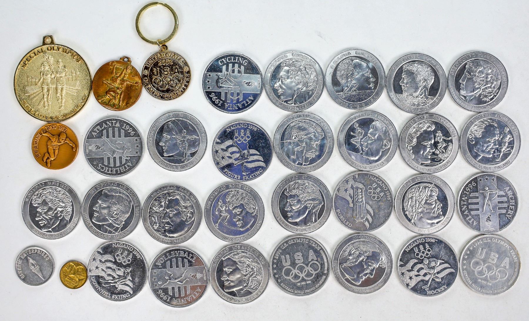 Group of approx. 35 commemorative coins/medals from the Olympics, various locations and years. Most in great condition.