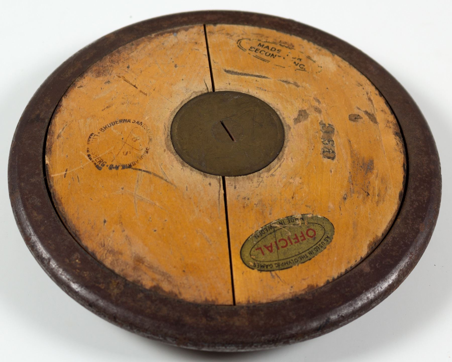 Marked with the sticker “As Used in the Olympic Games, Official, Made in Sweden”. “USO” punched into both sides. “made for Becontxx, Inc”. Additional Swedish manufacturer stamp in 1.25” circle showing places of manufacture(?). The only clue to ownership and use may be in two initials scratched into the center “(F?) D.” These initials have only one possibility if they belong to the competitor that used this discus: Fred Dixon, a 1976 decathalete Montreal Olympian that competed neck and neck with Bruce Jenner. State: City: HWAC#: 41227 Date: