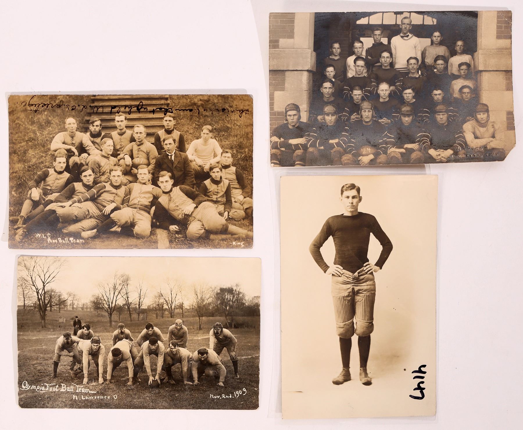 5 football postcards. RPC-Akron player, 1909 Olympia ball team, team portraits in helmets-lower right chip, W L C. 1951 It's Rally Day. [