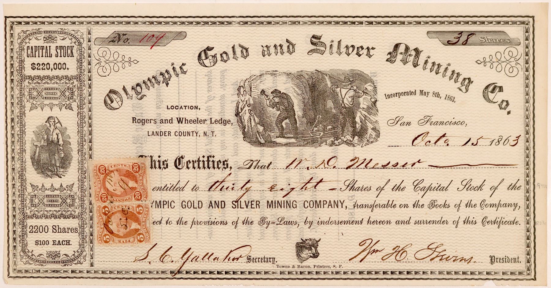 Location: Roger and Wheeler Ledge, Lander County, N.T. (printed to the left of the vignette). Inc. May 8th, 1863. No. 109, issued for 38 shares to W.D. Messer on Oct. 15th, 1863. Signed by president William H. Stevens and secretary S.C. Gallagher. Not cancelled. Black border and print on blue paper. Underground mining vignette by Loomis, plus smaller prospector vignette at left. Printed by Towne & Bacon, SF. Two revenue stamps (20 and 5 cent) attached on the left. 5.5 x 10.25" Folds, piece missing on bottom border, some toning. No listings found on CDNC. Company listed in 1864 Langley with an office in the Government House. William H. Stevens is listed as the ex. Deputy Postmaster. William D. Messer is a commission merchant. Ken Prag Collection