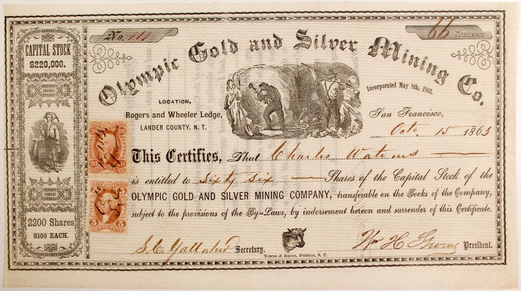 # 111 for 66 shares to Charles Watkins. SIgned by SC Galla--- and president William H Strong. Dateline San Francisco Oct. 15, 1863. Incorporated May 8th, 1863. Small 5c and 20c revenue stamps. Not cancelled. Underground mining vignette. Towne & Bacon printer. Location: Rogers and Wheeler Ledge, Lander Co., N. T. No edge corner, pinhole or discoloration issues. The Reese River Reveille lists this company in the Big Creek Mining District. John Gray was superintendent. A 20c assessment as being levied. [Reese River Reveille, October 3, 1863] State: Nevada City: Big Creek Mining District Date: 1863 HWAC# 84573