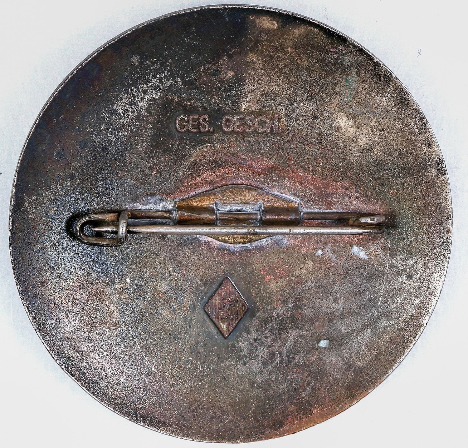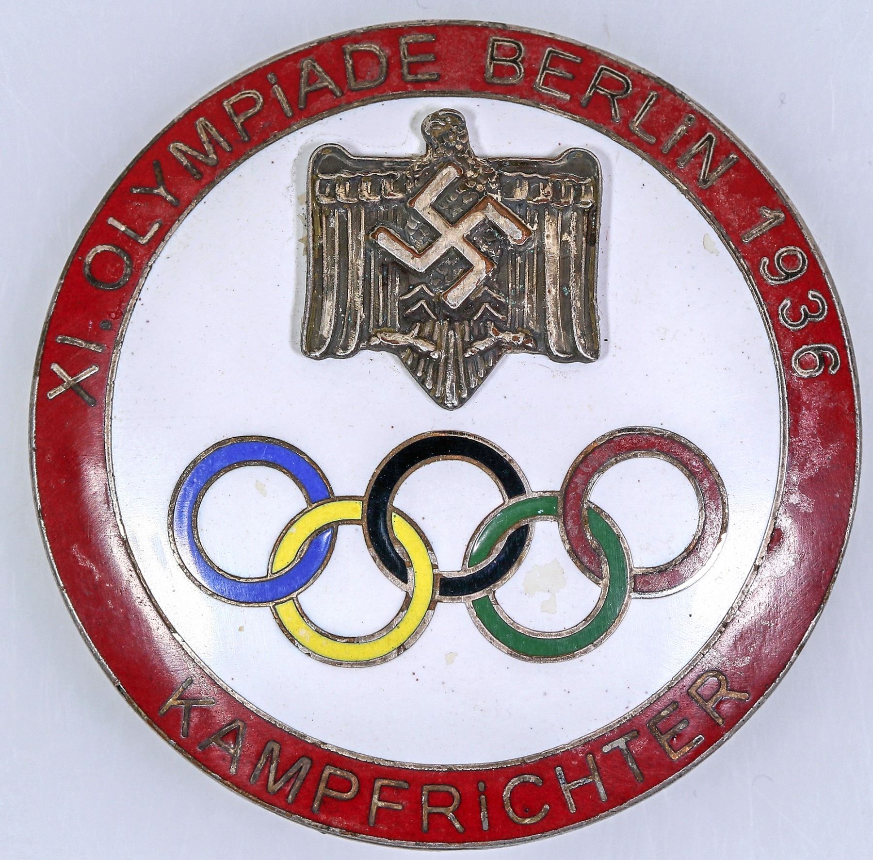 Colorful enameled pin badge, two inches in diameter. "XI Olympiade Berlin 1936 / Kamprerichter. Reverse is stamped Ges. Gesch. (the German equivalent of patent, or trademark). After some research, apparently the Olympic committee, forbade the swastika symbol on any official badges and there are no known photographs of judges wearing one.