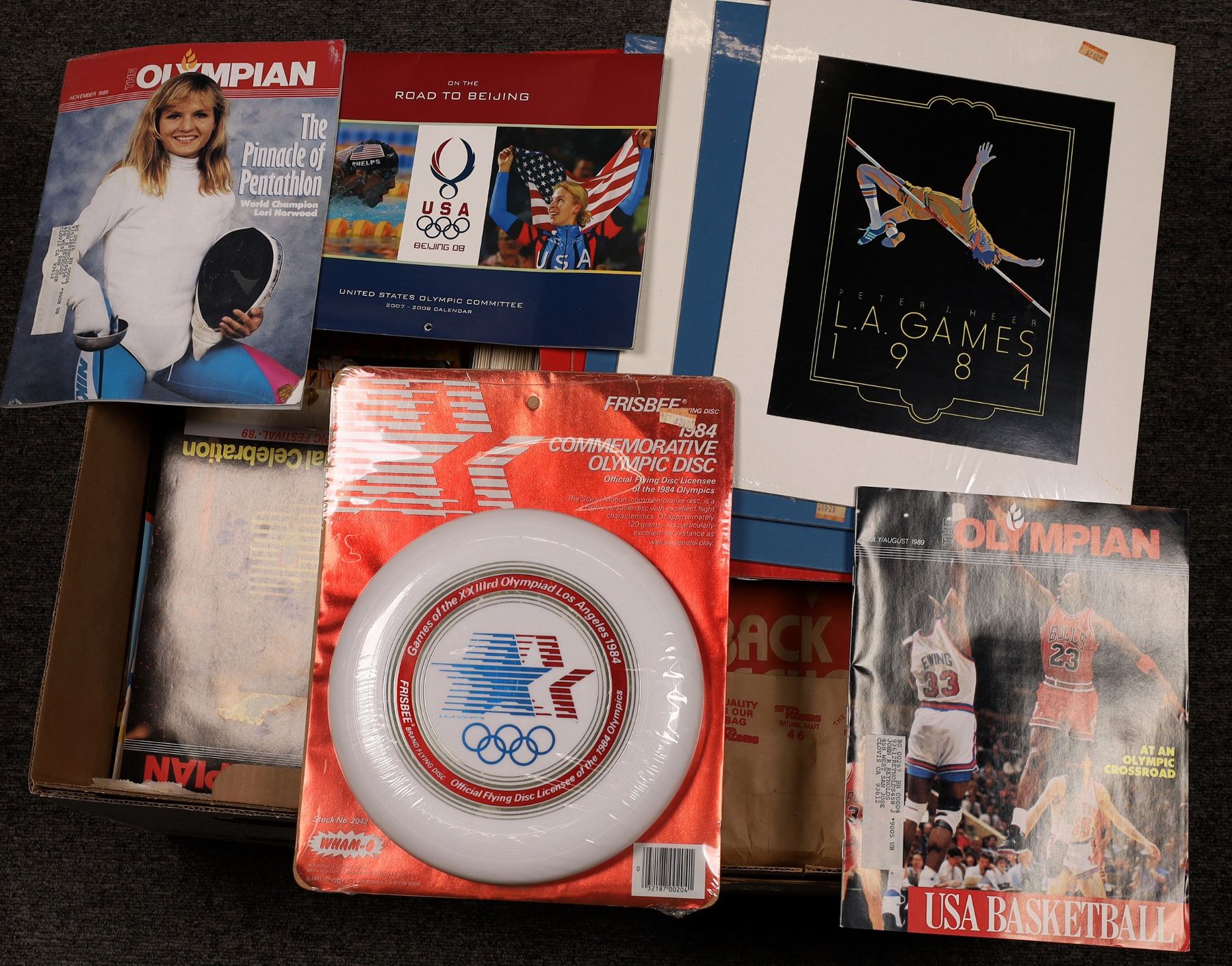 Olympic 1984 souvenir collection: Mugs, glassware, 5 prints of boxing, swimming, commemorative Olympiad Disc, L.A. 1984; Books & Magazines. 2 Banker's Boxes 15"x10"x12".
