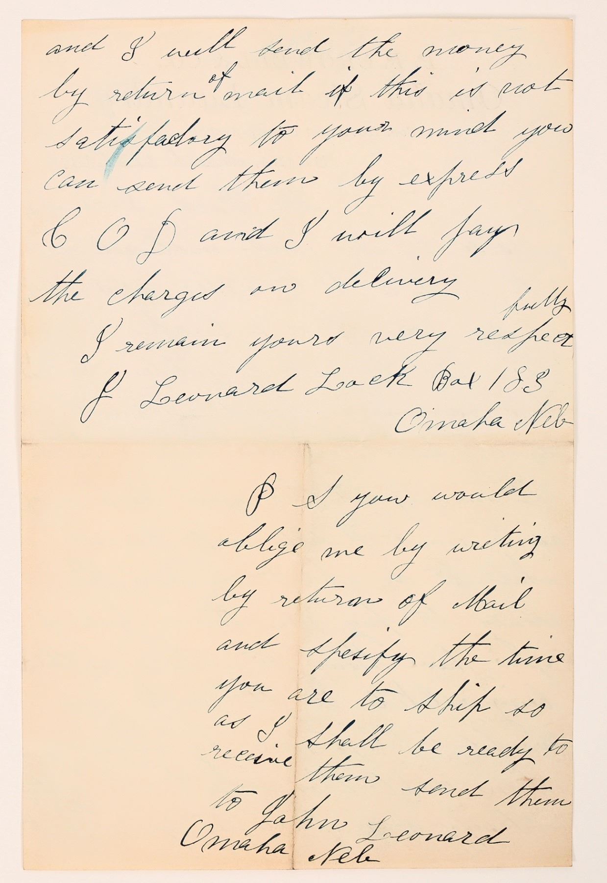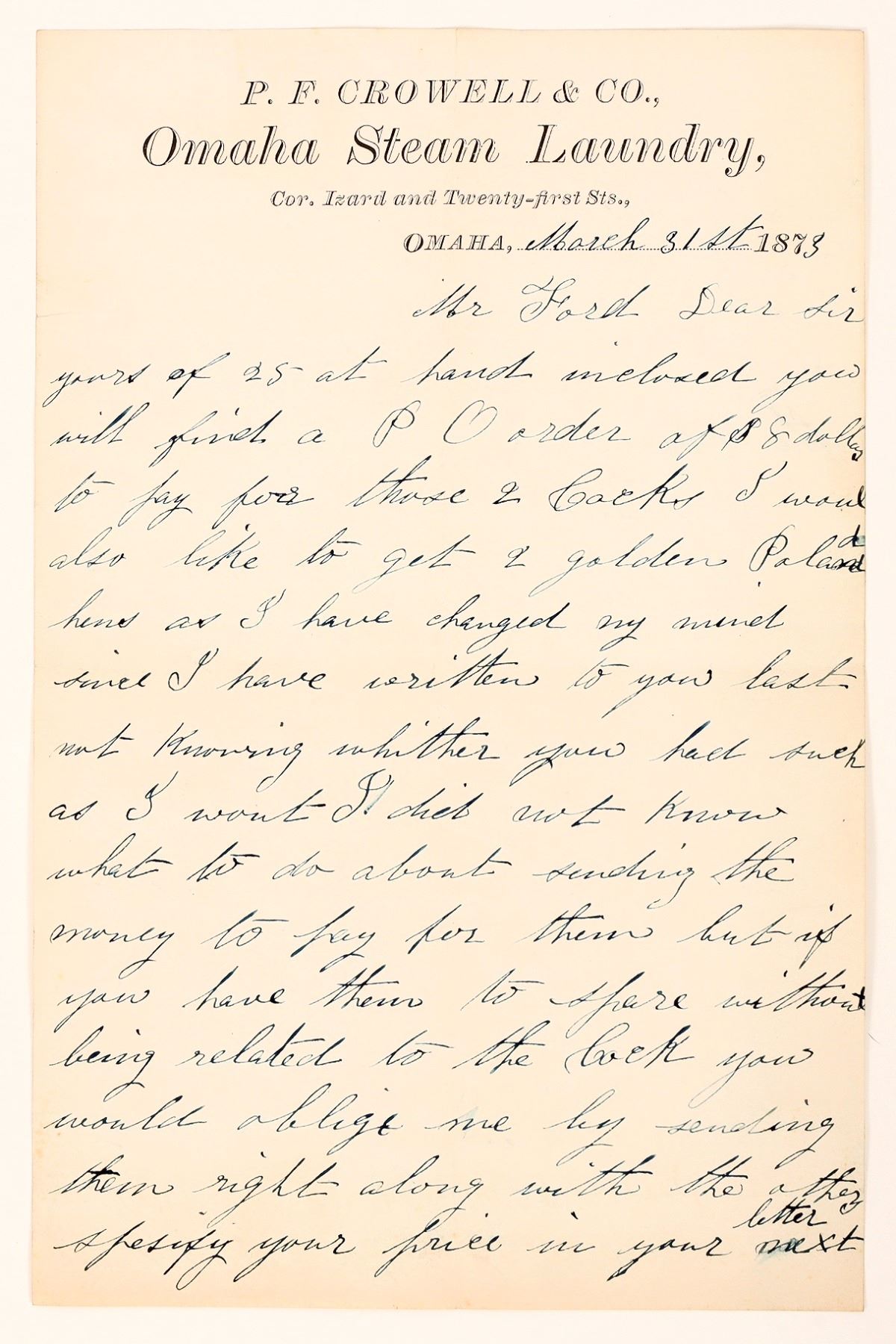 1873 letter from Leonard Lack of Omaha, Nebraska to one Mr. Ford regarding the purchase of two roosters and two hens. Handwritten on paper with a letterhead reading 'P.F. Crowell and Co., Omaha Steam Laundry'. [ Omaha Nebraska
