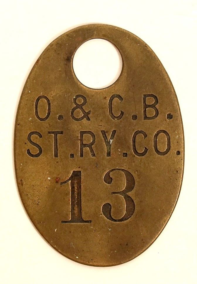 A luggage tag for the Omaha & Council Bluffs Street Railway. It's stamped O.& C.B.T. RY. CO. 13. It measures 1"x 1.5" and is in very nice condition. Please see photos for more details.