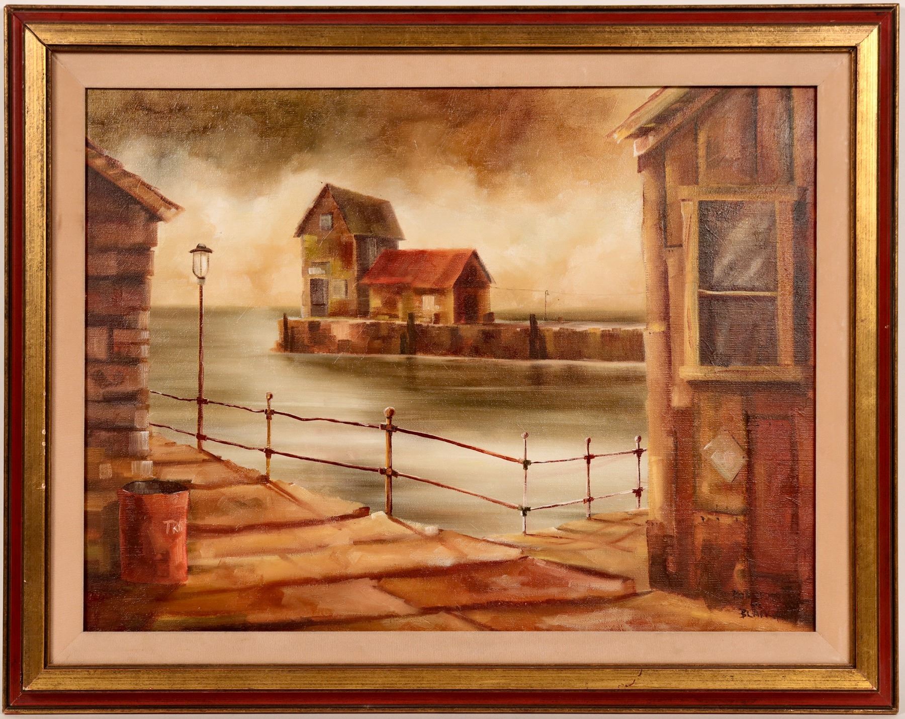 On The Dock, oil painting by Robert H. Blair (1937-2016). Blair lived in Arizona, New Mexico, and Texas. He was a well-known western American painter/artist. This is a fine example of Robert H. Blair's work (autographed on lower right). 18 x 24 in. painting in wood frame, 22 x 29". Very small repaired spot to the right of the boathouse - please inspect. Fred Holabird Collection