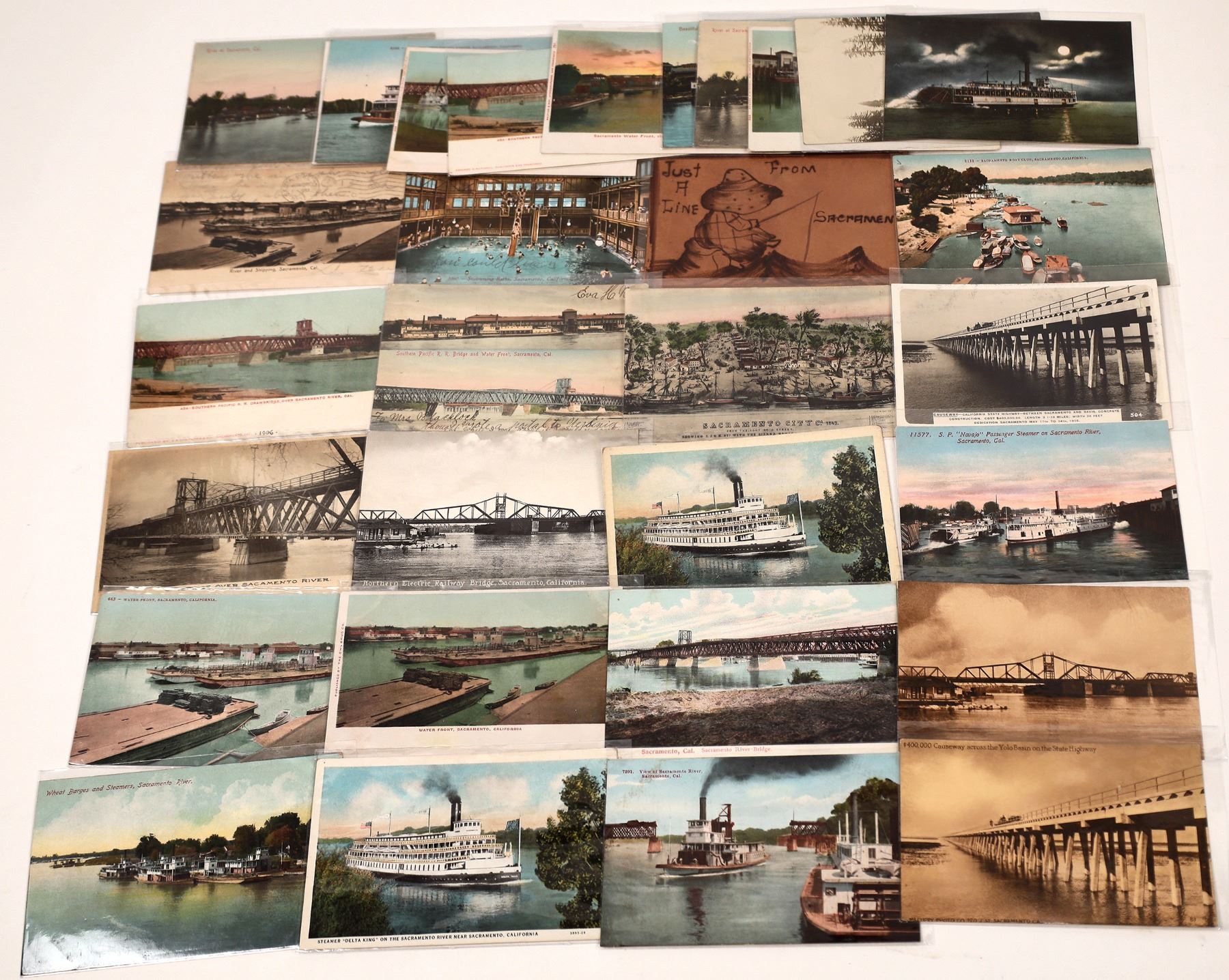 Lot of 32. Many early pre-divided backs. One leather postcard, clean, front just A Line drawing of person fishing. Five postmarked w/ 1, 2 cent stamps ; Dixon, Sacramento, Santa Cruz,, Winters. STREET level: S.P Navajo passenger steamer, delta King passenger steamer, S.P. Bridge, Northern Electric Railway Bridge, Sacramento Boat Club. BIRDSEYE : Color drawing Sacramento City 1849 J & KSt. depicting square riggers, steamers State:California City:Sacramento Date:1905-10 Provenance: Ken Prag Collection