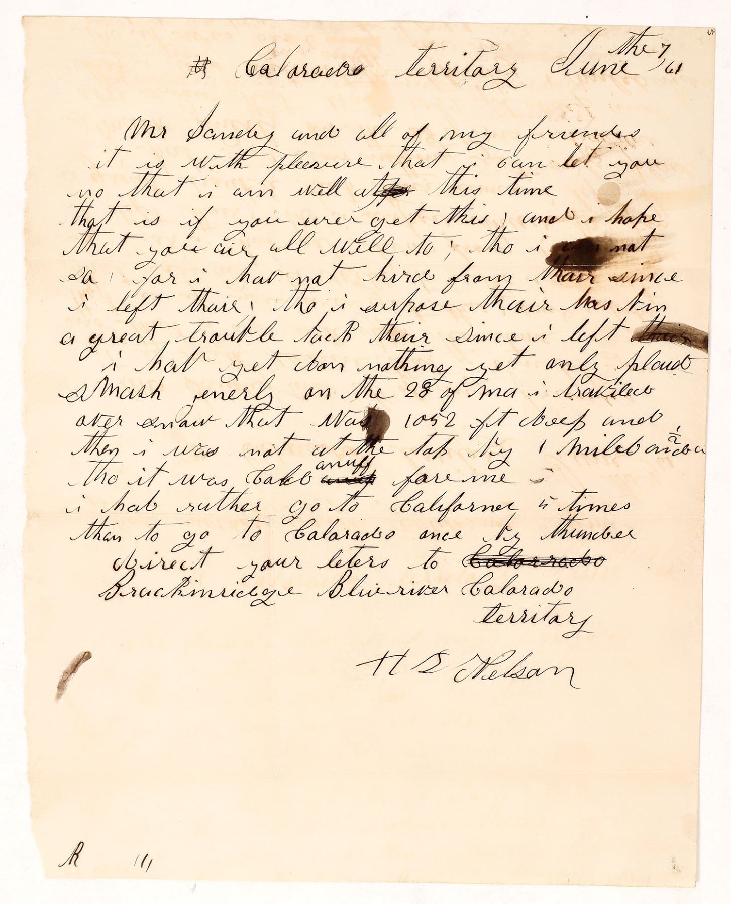 One of the earliest letters known to exist from the Breckinridge, Colorado Territory area. The letter is dated 1861, one year after the post office was established in the town of 100 people. Originally spelled Breckinridge, after one time vice president John Breckinridge under James Buchanan, it was changed in 1861 to Breckenridge in 1861, after the former VP became an officer in the Confederate Army. This letter does not reflect that change. Breckenridge Colorado