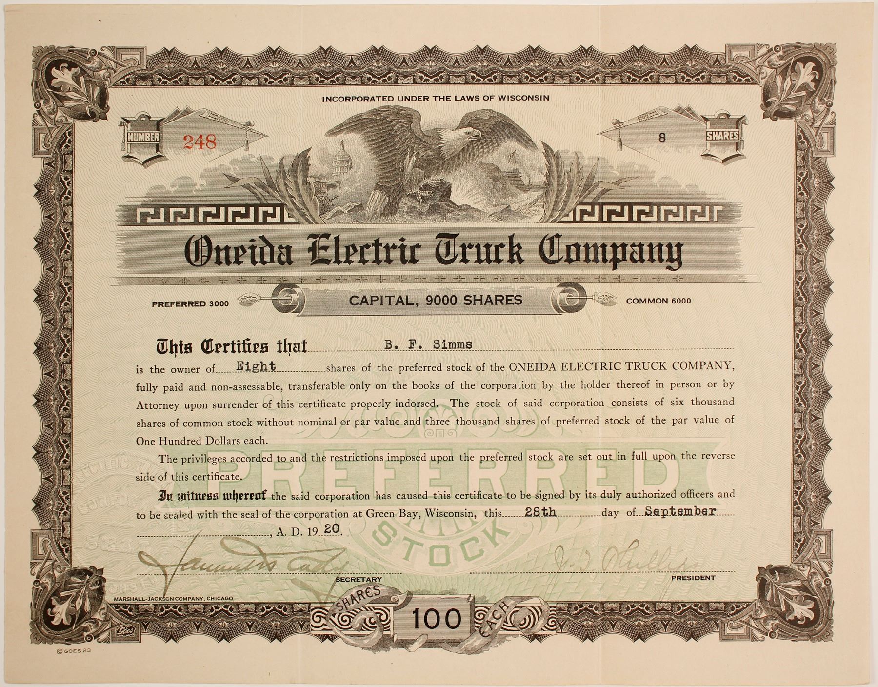 8 shares of Oneida Electric Truck Co cert. # 248 dated Sep 28, 1920 issued to B. F. Simms. Inc. WI. Grey border. Raised co. seal. Vignette of eagle with buildings in background. An electric truck is an electric vehicle powered by batteries designed to deliver cargo. Oneida Electric Truck Co., like many others of this time period started small and may have only lasted a few years. No information available on the company as to dates of operation, owners, even states in some cases, earlier name and if they consolidated with another company, went into bankruptcy or just closed. Printed: Marshall-Jackson Co, Chicago. GOES 23. Prag collection.