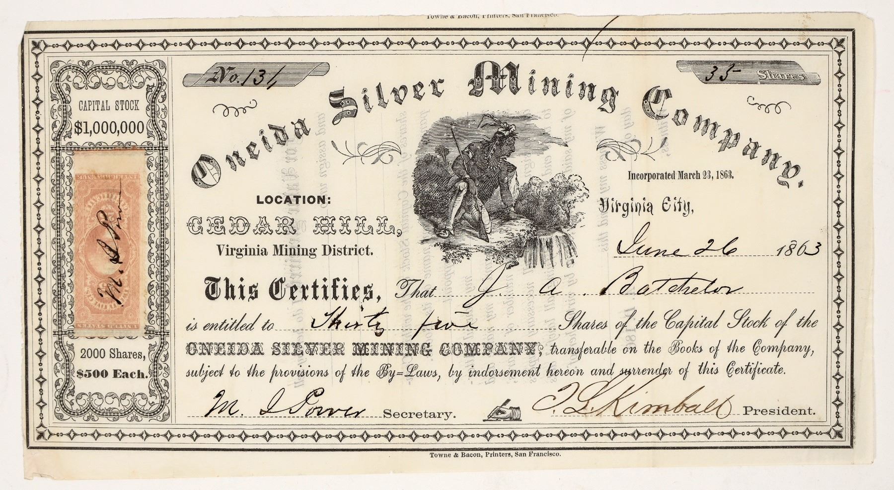 Oneida Silver Mining Company Stock Certificate, Cedar Hill, Comstock, 1863 [203944]