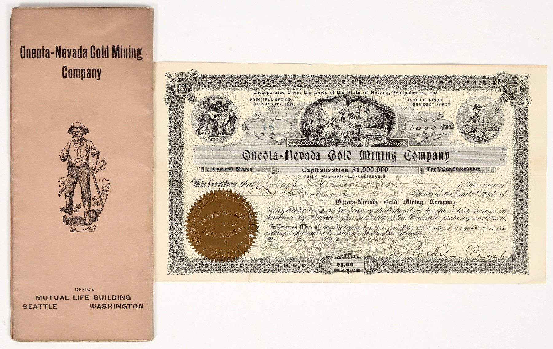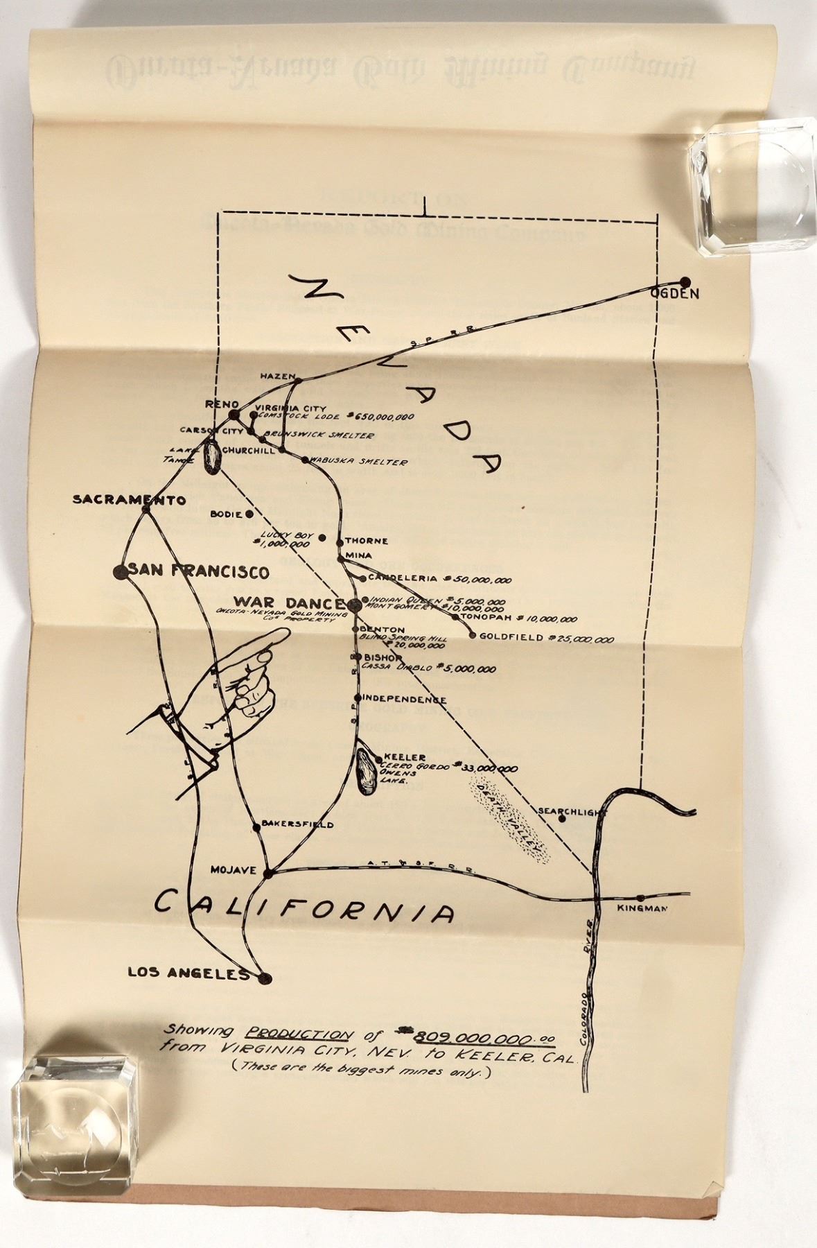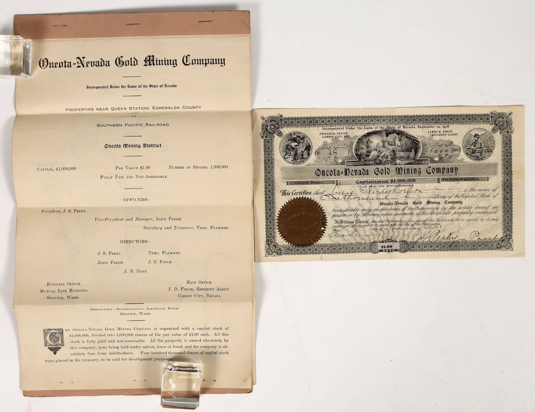 Lot of 2. Mine properties were near Queen Station, Esmeralda County, Nevada. Stock issued in 1908, not cancelled. Signed by president JS Perky and secretary Theo. Flammer. Three mining vignettes. Prospectus is five pages with map. Claims include Klipper, Excelsior, Midnight No. 1 & 2, and Midnight Fraction No. 3