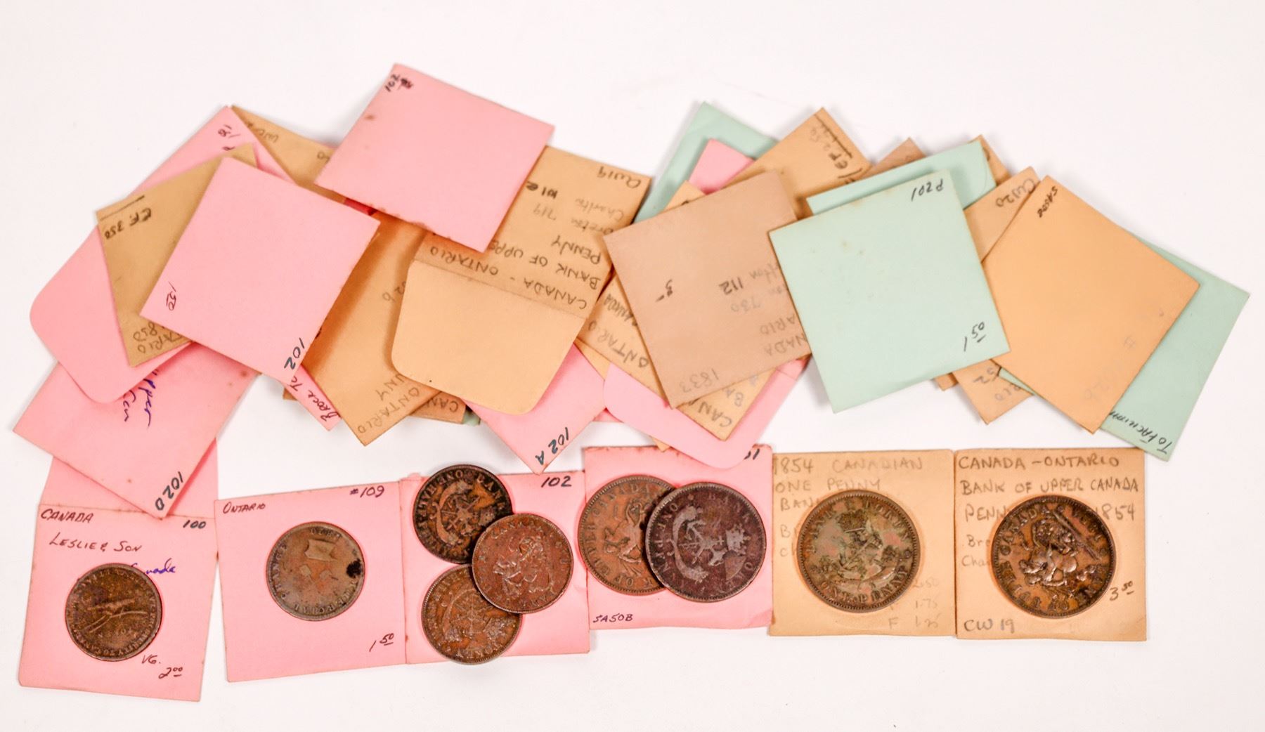 Lot of about 45 pennies and half pennies from the Bank of Upper Canada in Ontario from the 1830s-1850s. One is a brass counterfeit 1812 half penny. Some are Lesslie & Sons. City: State: Date:
