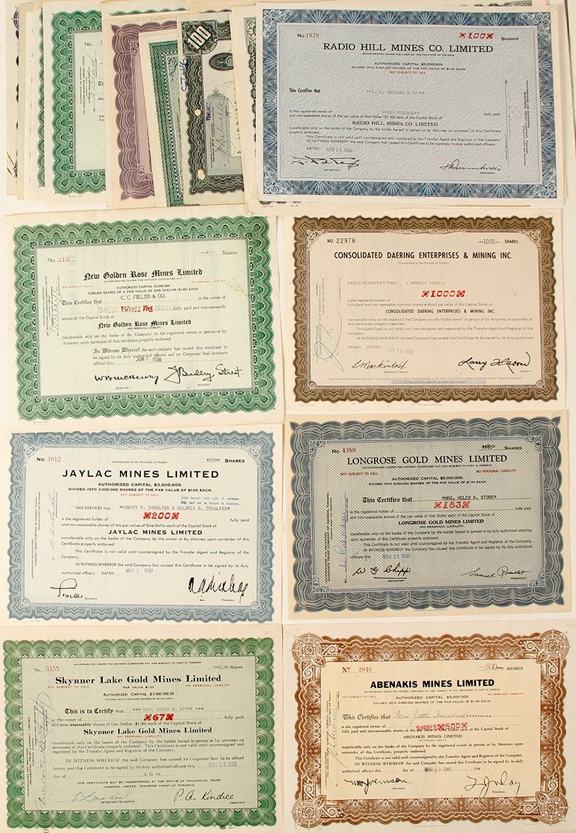 Lot of 27. Some duplication. Issued 1910-1974. Companies include: New Golden Rose; Atlas Exploration Co.; Abenakis Mines Ltd.; Aconda Mines; Cons. Daering Enterprises & Mining Inc.; Desmont Mining Corp.; Frobex Ltd.; Indigo Cons. Gold Mines; Burchell Lake Mines Ltd.; Swastika MC; Abba Mines; La Rose Mines; Skynner Lake Gold Mines; Starlight Mines; Chicago-Gow Ganda Mines Co.; Longrose Gold Mines; Starcourt Gold Mines; Radio Hill Mines Co.; and Jaylac Mines. Please inspect. (Prag Collection) Date: 1910-1974 Location: Ontario, Canada HWAC# 63060