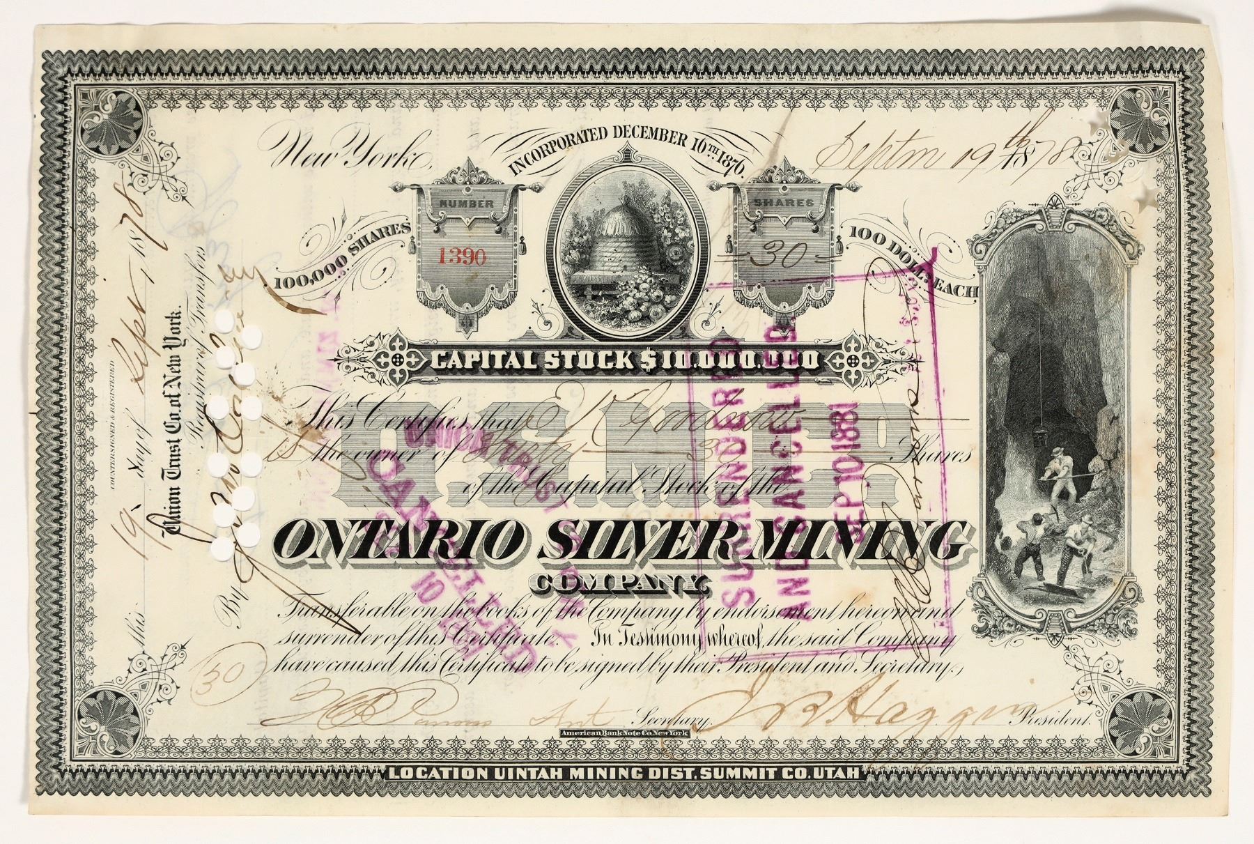 Ontario Silver Mining Co. stock certificate number 1390 issued to New York financier and railroad man E. K. Goodnow for thirty shares on Sept. 19, 1878, signed by Company president J.B. Haggin. The Ontario was the biggest silver mine in America, owned by partners George Hearst, Lloyd Tevis and JB Haggin as principal shareholders.
