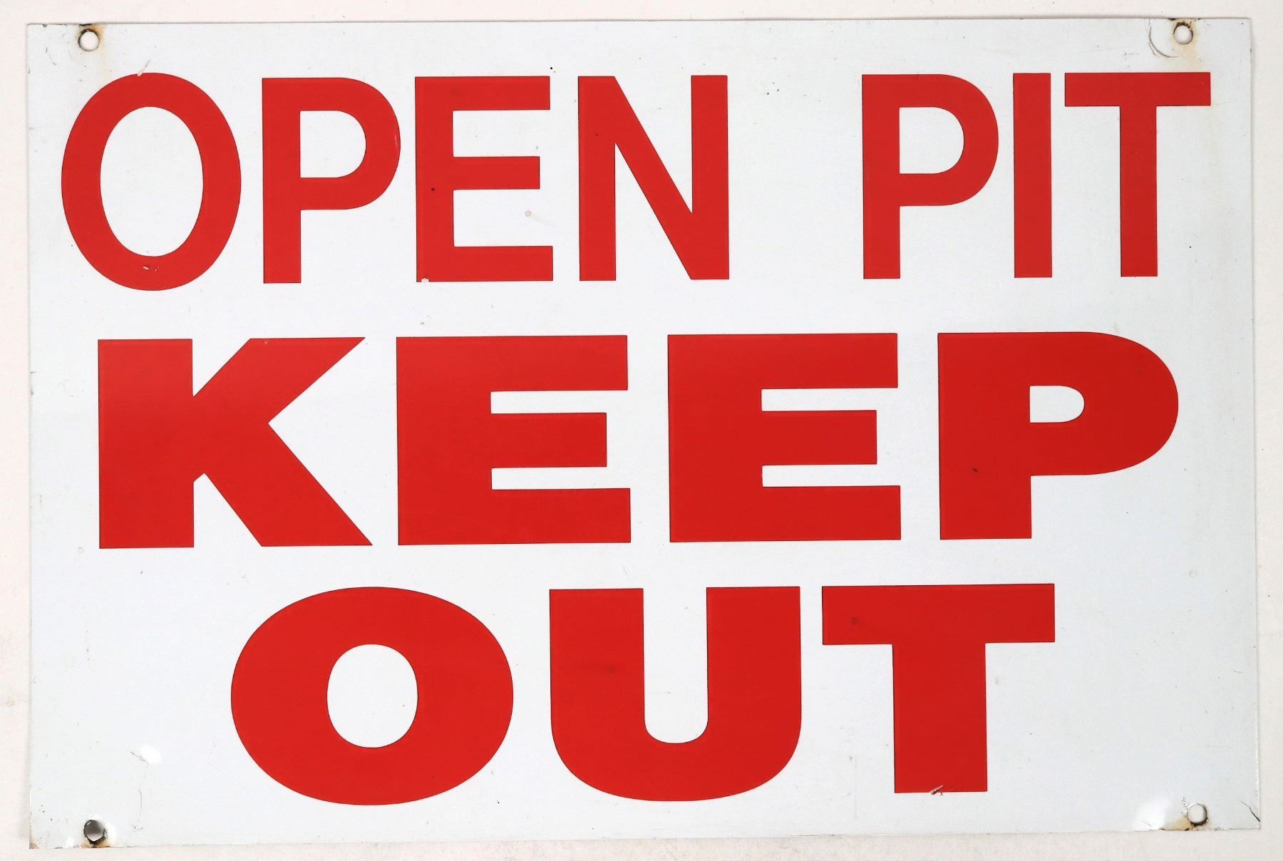 Red over white single side Open Pit/Keep/Oot metal sign. 12x18". Some light scuffs and open area rust.