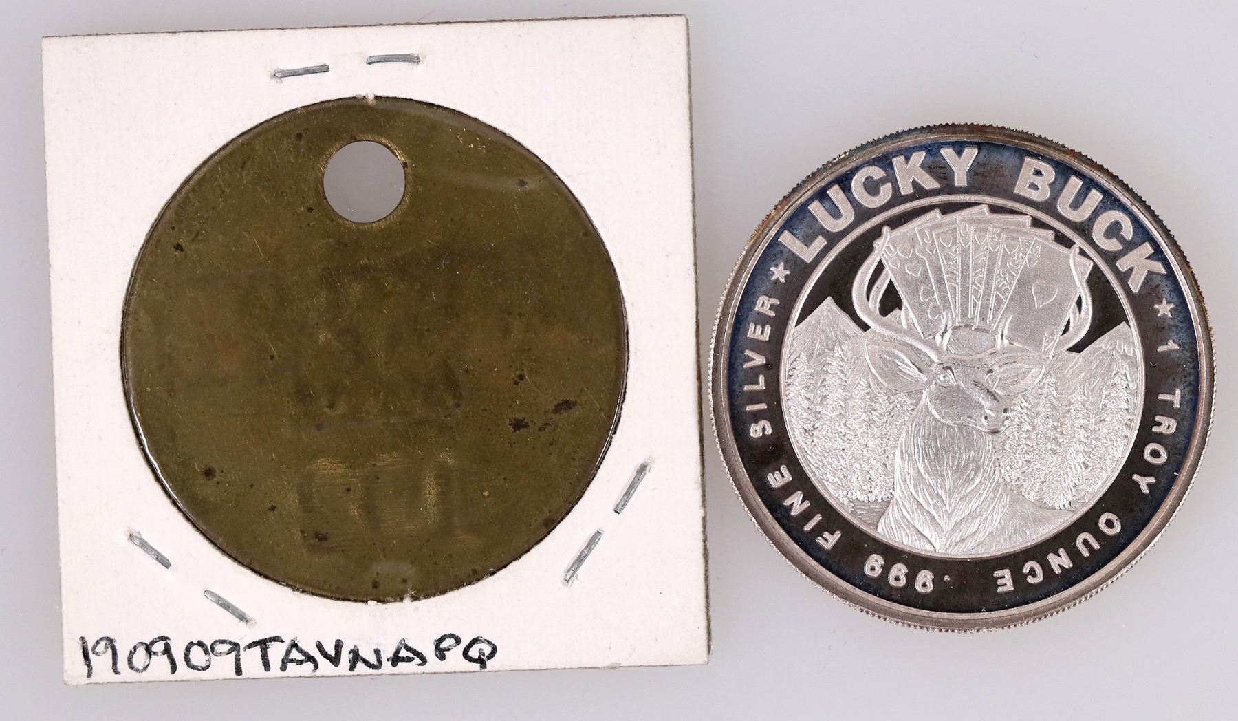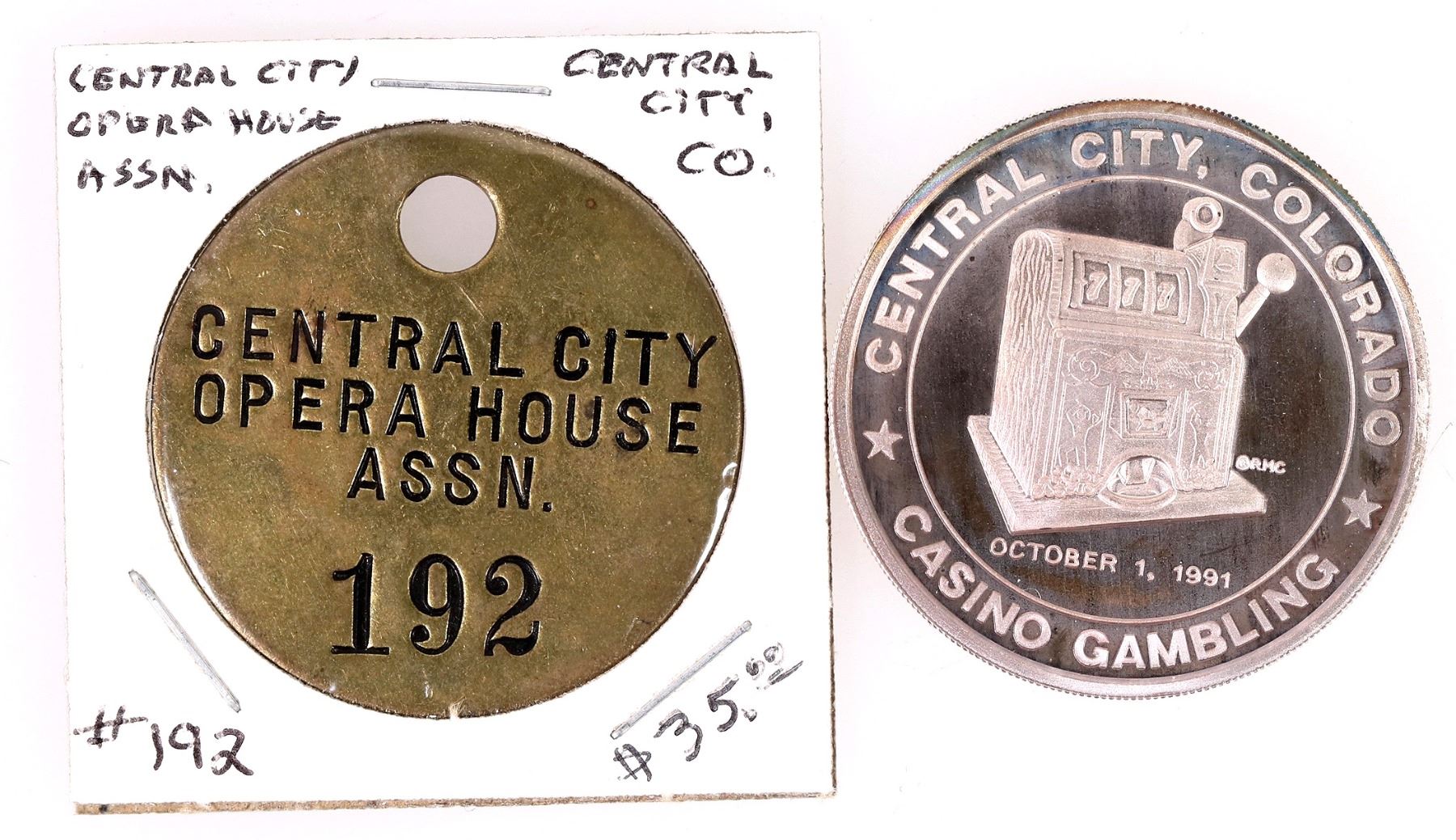 Two Central City Colorado pieces: 1) Central City, Colorado casino gambling October 1, 1991; one troy ounce .999 fine silver Lucky Buck. 2) Brass tag, holed Central City / Opera House / Assn. / 192.; 38 mm.