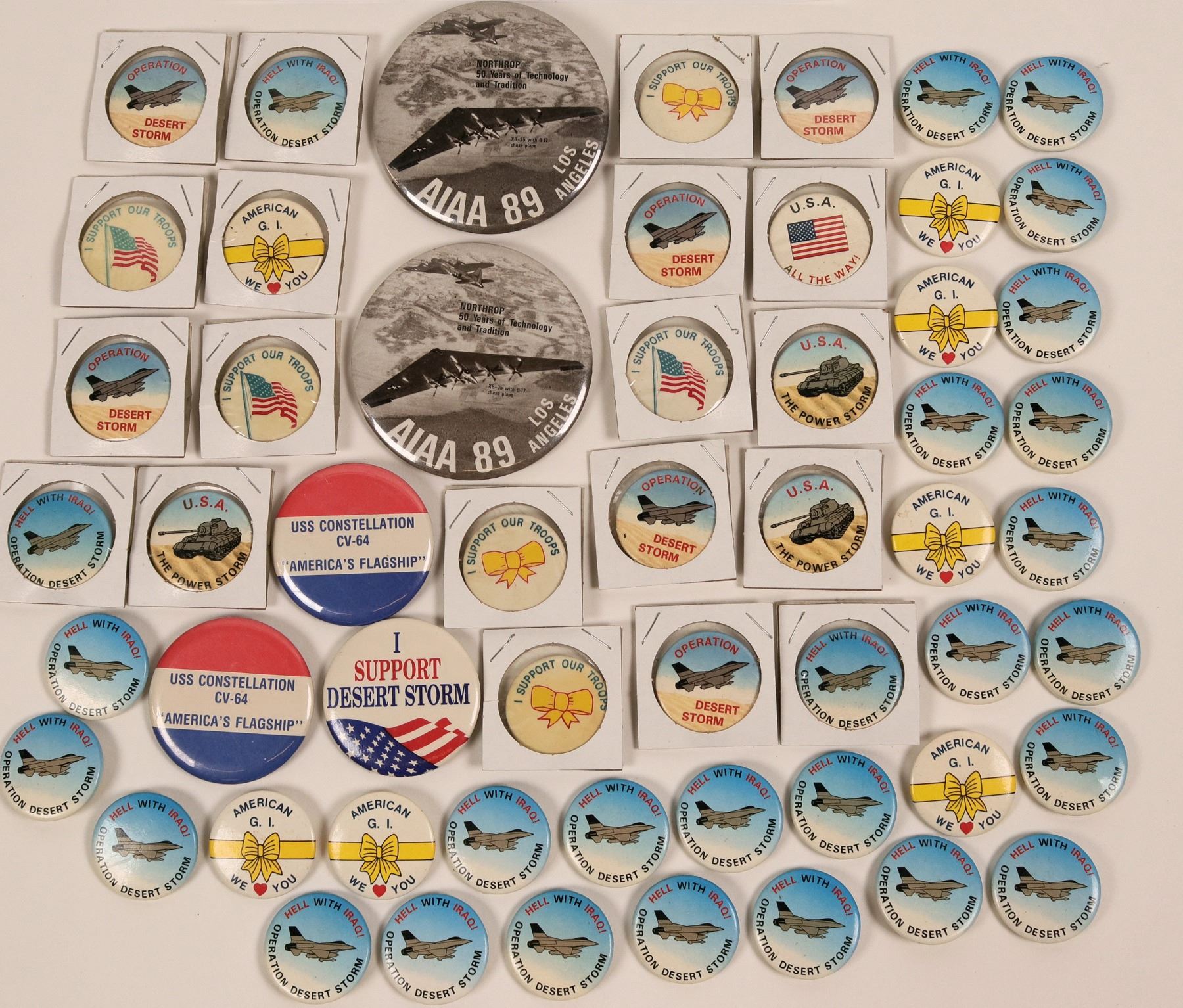 Lot of 55 pinback buttons from Operation Desert Storm, which took place Aug 2, 1990 – Feb 28, 1991. Includes 27 Hell With Iraq!/Operation Desert Storm center jet litho, one USA/All the way!/center American Flag litho, seven American G.I./We love you/center yellow ribbon litho, and 20 more. See photo for details.