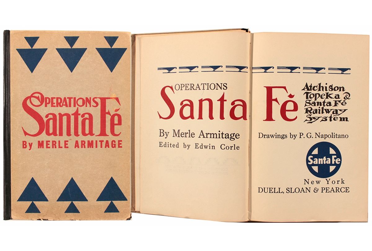 Operations: Santa Fe by Merle Armitage, 1948. Merle Armitage, railroad aficionado writes about the railways in Atchison, Topeka and Santa Fe. Book includes illustrations by P.G. Napolitano. 263 pages. Hardcover. Considerable abuse to the text block and the spine as the spine is becoming increasingly dethatched from the text block, Front and back covers have color text that has been faded. Overall poor condition.