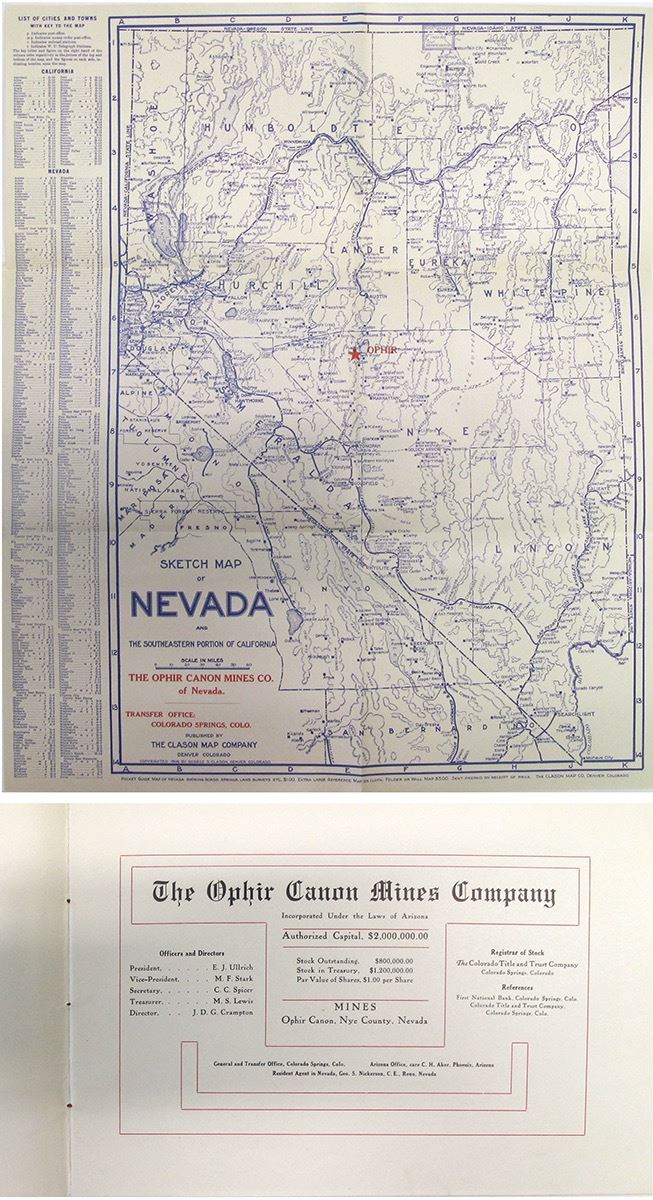 Mines in Ophir Canyon, Nye County, Nevada. Inc. in Arizona. This 23 page prospectus is fabulous. It has a six panel fold out map (14 x 17") of Nevada showing the Ophirs in the middle of the state. Seven photographs and 4 maps. Not only promotes this mine, but the history of the area - which is a great reference! They are trying to restart mining in the area after it has been idle since the late 1880s. Has original (very beat up) envelope. Prospectus is 6 x 9" and in very nice condition. Map is nearly perfect! Date: c.1906 Location: Nye County, Nevada HWAC# 66091