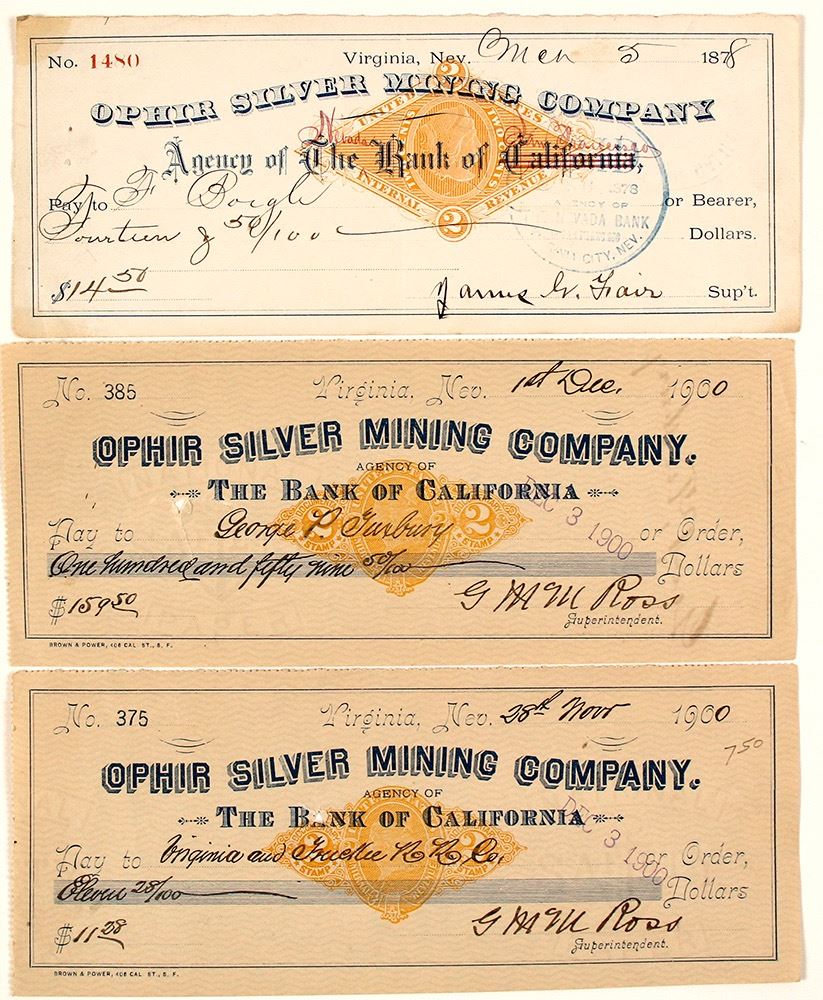 Lot of 3 for the famous Ophir Mine, one of the oldest claims on the Comstock and the discovery site for the Virginia City branch of the lode. It was located at the north end of Virginia City between the Mexican and California mines and discovered by McLaughlin & O'Riley. 1) Ultra-rare RN-G1, Nevada Bank of San Francisco (over Bank of California), signed by James G. Fair. Issued to well-known bookseller F. Boegle in 1878. Cut cancel and corner stains. 2) Two Bank of California, RN-X checks issued in 1900 and signed by G.M.M. Ross as superintendent. One is issued to the Virginia & Truckee Railroad. Both cut cancelled. Date: Location: Virginia City, Nevada HWAC# 57620