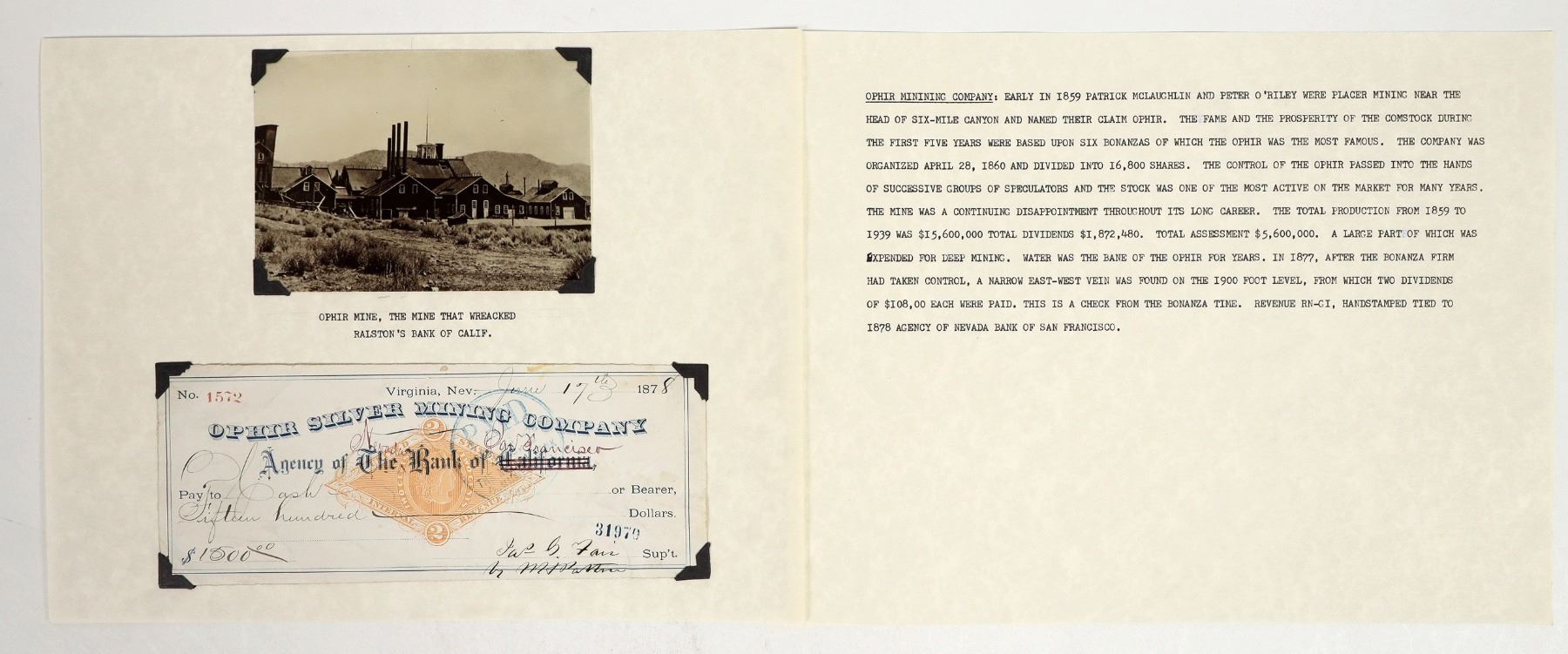 Rare. 1878 Nevada Bank of San Francisco (handwritten over Bank of California) check with RN-G imprinted revenue. Signed for James G. Fair by Patton. Issued for $1,500 cash. Stains, creases. Comes with small photo reprint of the Ophir Mine. The Ophir was the discovery site for the Comstock Lode in Virginia City.