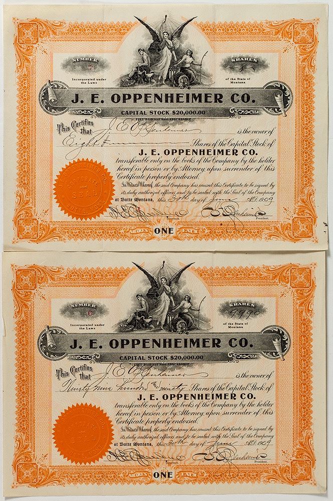 Two stocks: J. E. Oppenheimer Co., no. 6, 9990 shares and no. 7, 8 shares. Signed by J. E. Oppenheimer, president and issued to him, 1909. Great condition. City: Butte State: Montana Date: 1909 ID: 36263