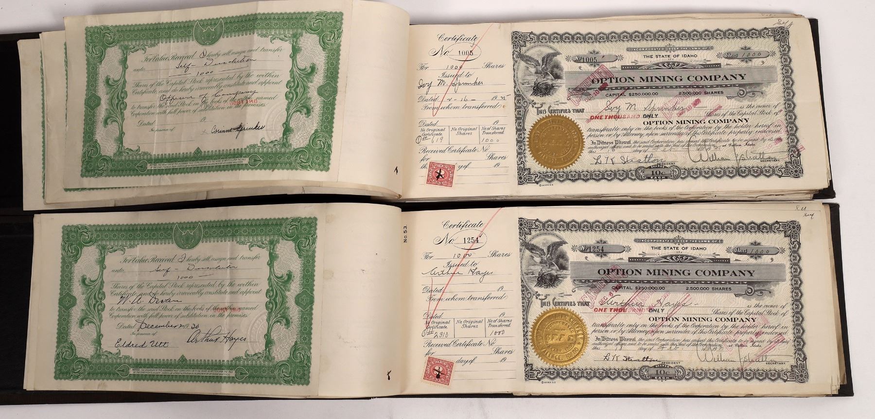 Two stock certificate books from the Option Mining Company in Idaho. The first book has about 110 certificates from 1925 and the second book has about 125 certificates, also from 1925. These certificates are issued and cancelled, many of them have affixed revenue stamps as well. These certificates also have a nice eagle vignette in the upper left-hand corner. Both books are about 15.25 x 6, good condition. State:Idaho City: Date:1925 Provenance: Stuart Mackenzie Montana Ephemera Collection